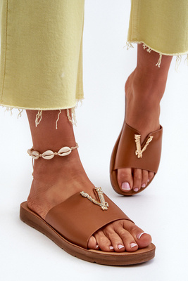 Klapki Damskie Płaska Podeszwa Ozdoba Eko Skóra Brązowe Makia