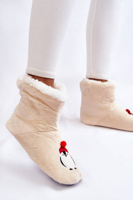 Papcie Damskie Wsuwane Ocieplane Pingwiny Beżowe