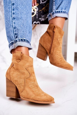 Damskie Kowbojskie Ocieplane Botki Na Słupku Karmelowe Margaret