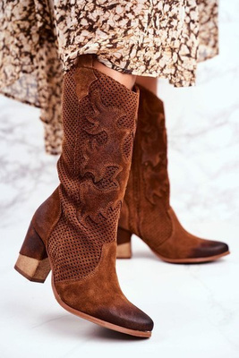 Damskie Botki Na Słupku Skórzane Wysokie Koniak Rosemary
