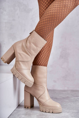 Fashionable Leather Boots On Chunky Heels Beige Meggie