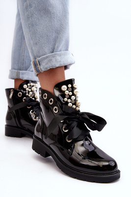 Leather Lace-Up Boots With Ornament Black Nicole 2750