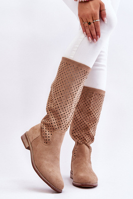 Women's Suede Openwork Over Knee Boots Beige Savannah