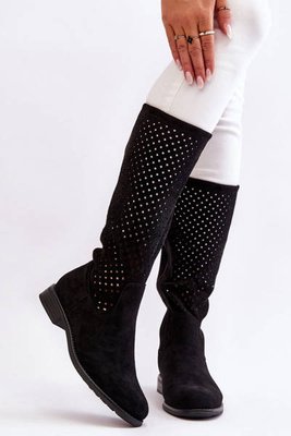 Women's Suede Openwork Over Knee Boots Black Savannah