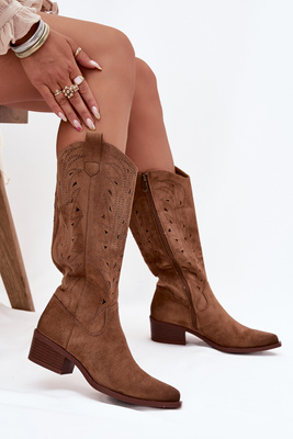 Cowboy Boots With Perforated Pattern On Low Heel Khaki Selirae