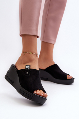 Women's Slippers Made Of Eco Suede On Wedge And Platform With Gold Decoration Vinceza 58295 Black