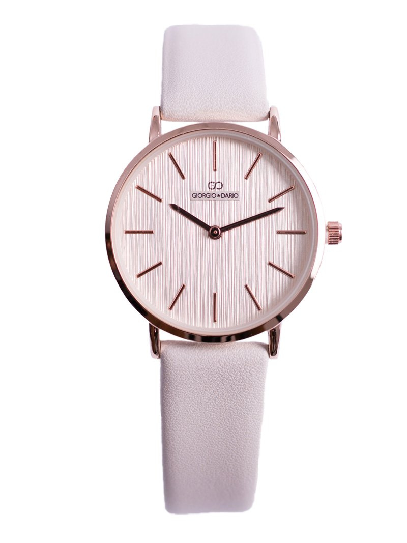 Jules is a classic and elegant line of Giorgio & Dario ladies' watches. Available in two sizes - with a small 33mm disc and a large 38mm. The watch has a slightly flat glass, thanks to which it looks better on the hand and at the same time is more readable. The strap is made of soft to the touch eco leather with the possibility of easier adjustment, gold-colored case made of surgical steel, suits both elegant and everyday stylizations. High quality of the mechanism and envelope.