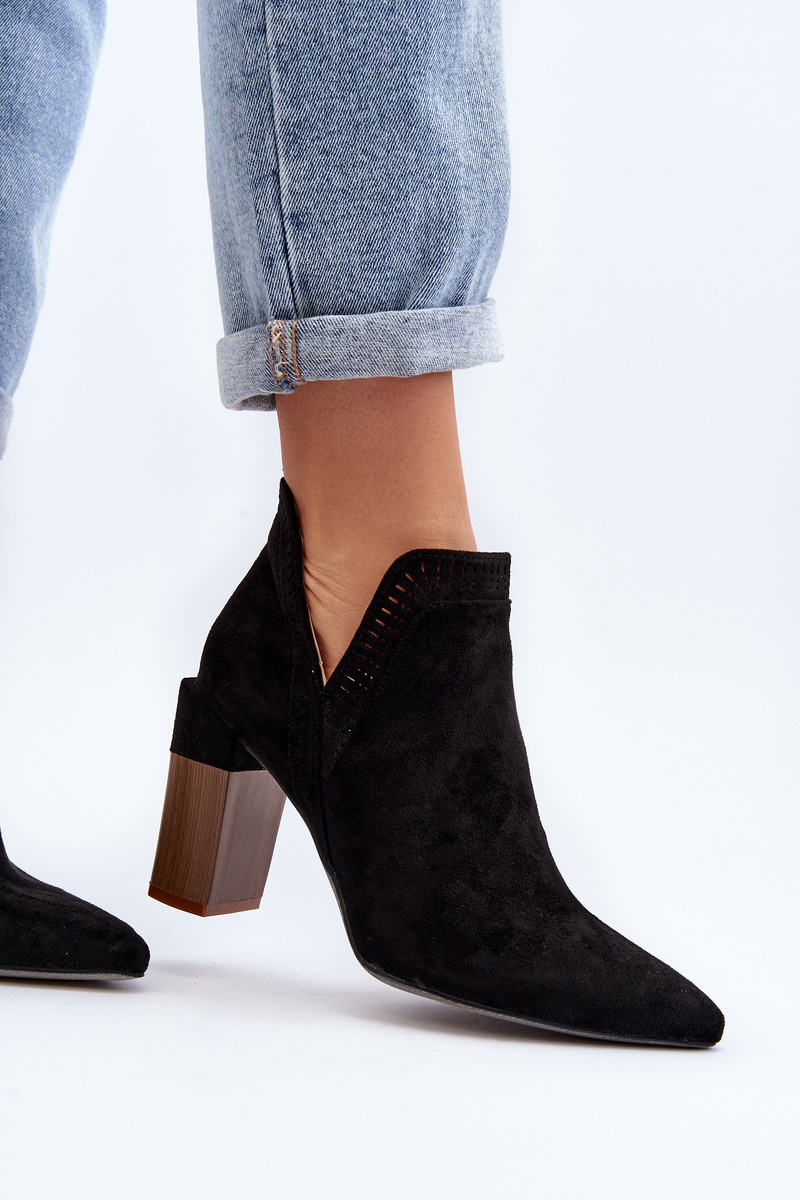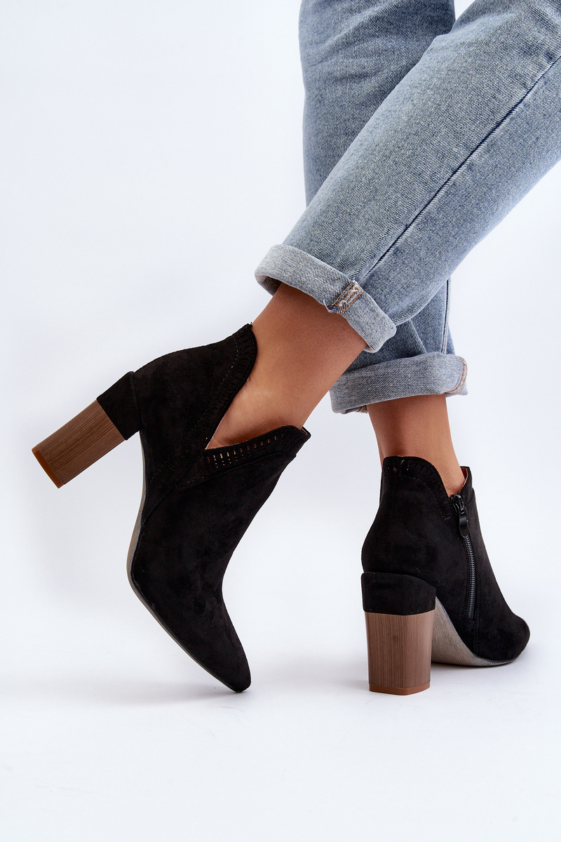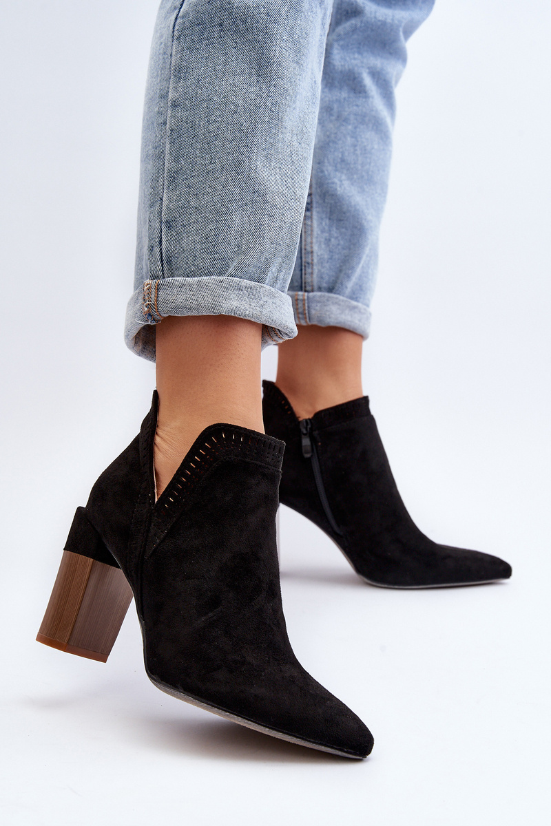 Women's ankle boots made of eco suede. Set on a column-shaped heel. Pointed toes will visually slim the legs. The upper is decorated with a lacy pattern. Fastened with a zipper on the side. You will definitely use them for many spring stylizations! When choosing a size, please refer to the size chart.