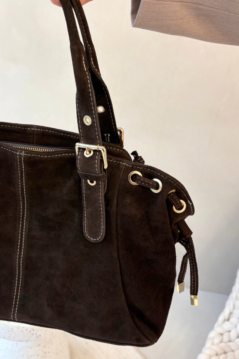 Women's handbag made of natural suede is a fashionable choice that works well for everyday wear and more formal styles. Gold hardware emphasizes a feminine character. The model features internal pockets that facilitate organizing essential small items. The handbag has comfortable handles for carrying in the hand and does not have an additional strap, giving it a classic, minimalist appearance. A stylish accessory that complements almost any outfit.