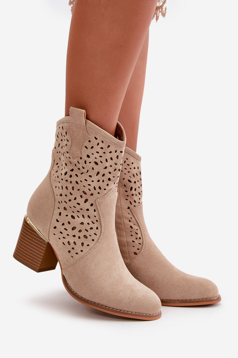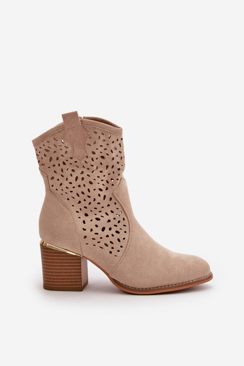 Women's boots made of eco suede, featuring a latticed upper that reaches beyond the ankle. Set on an elegant column heel adorned with a golden element, giving them a unique character. Fasten with a zipper, ensuring ease of use. Rounded toes emphasize their classic and stylish look. Perfect for everyday and elegant styling. When choosing a size, please refer to the size chart.