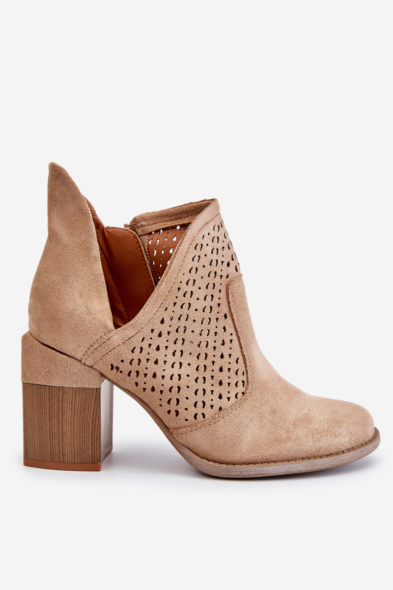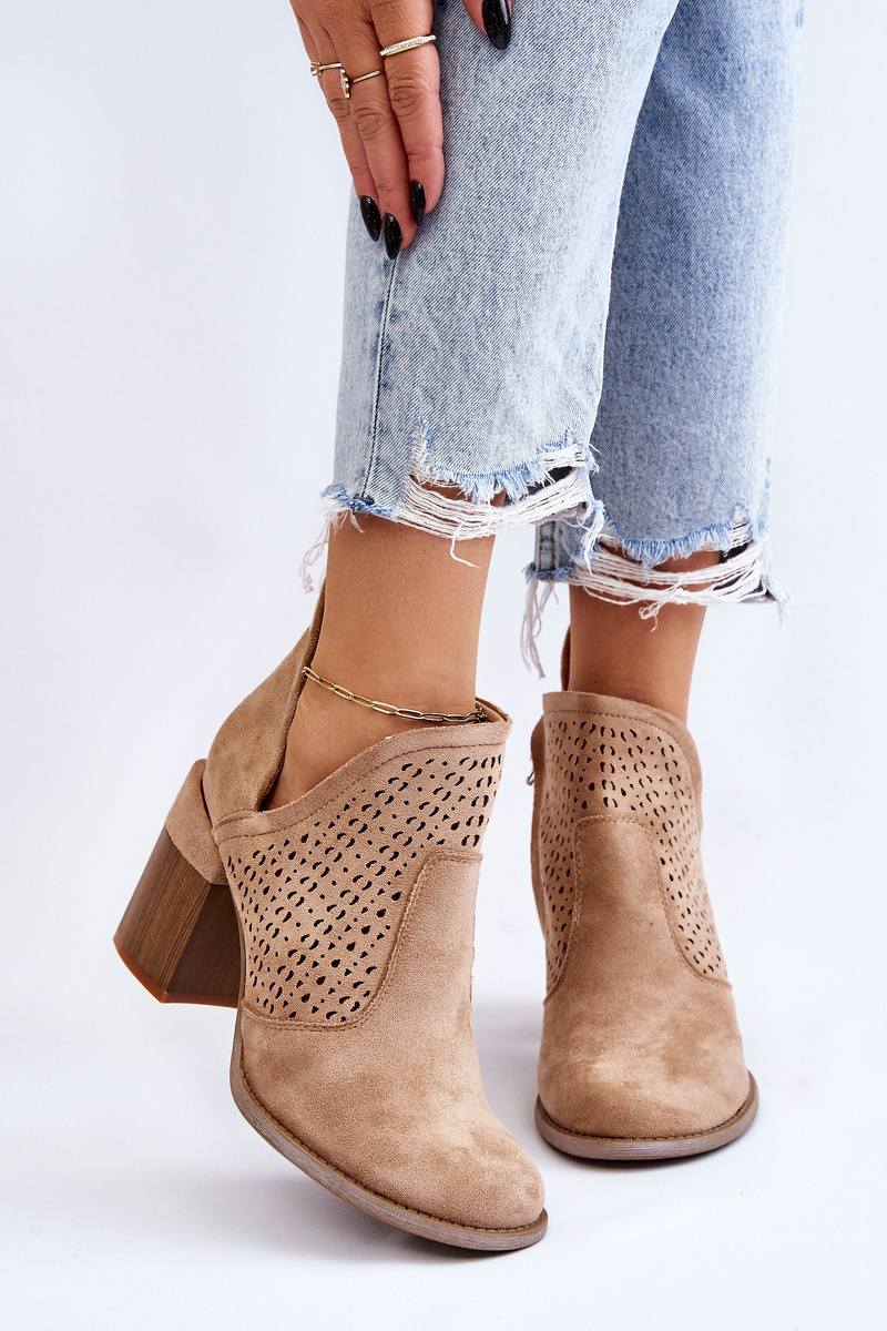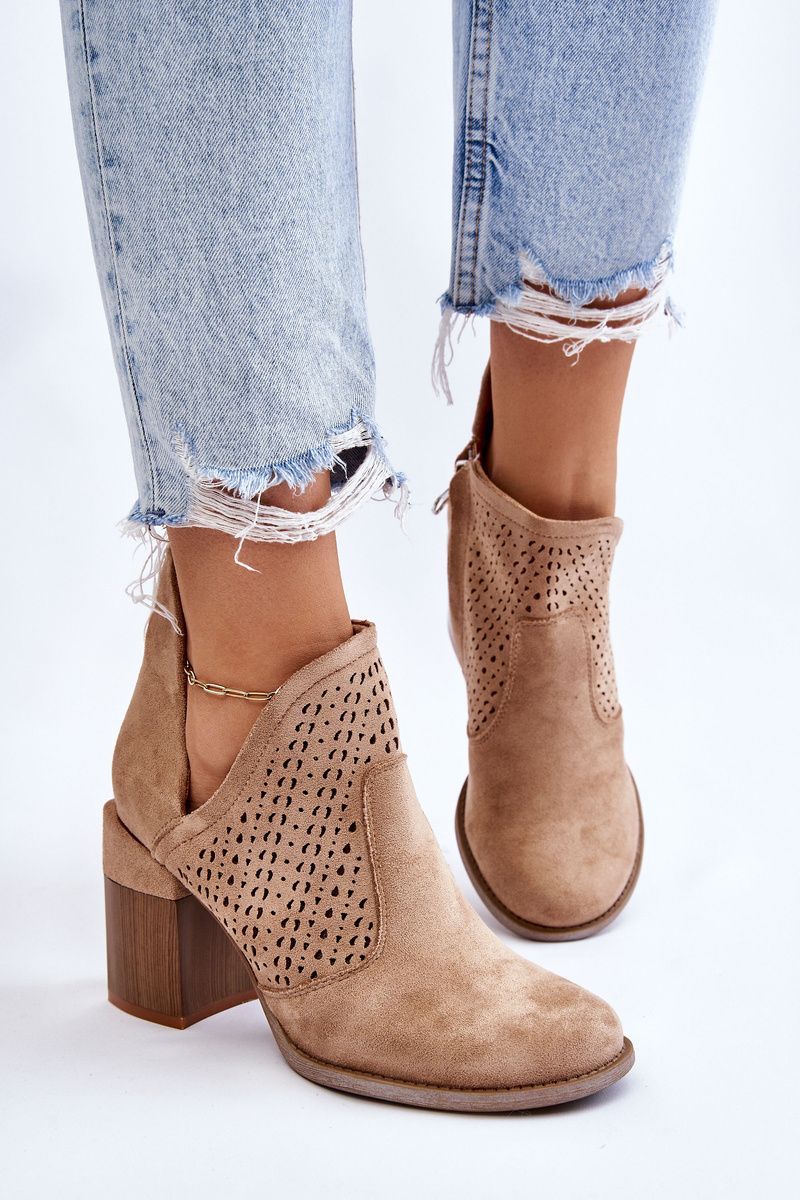 Boots with a cut-out for the ankle have been additionally decorated with an openwork pattern. Made of soft to the touch eco suede. Set on a massive heel in the form of a block. This model has a zipper on the side of the upper. The heel counter in these boots is stiffened. The soft and comfortable insole is made of eco leather. This amazing model should be in your wardrobe! When choosing a size, please refer to the size chart.