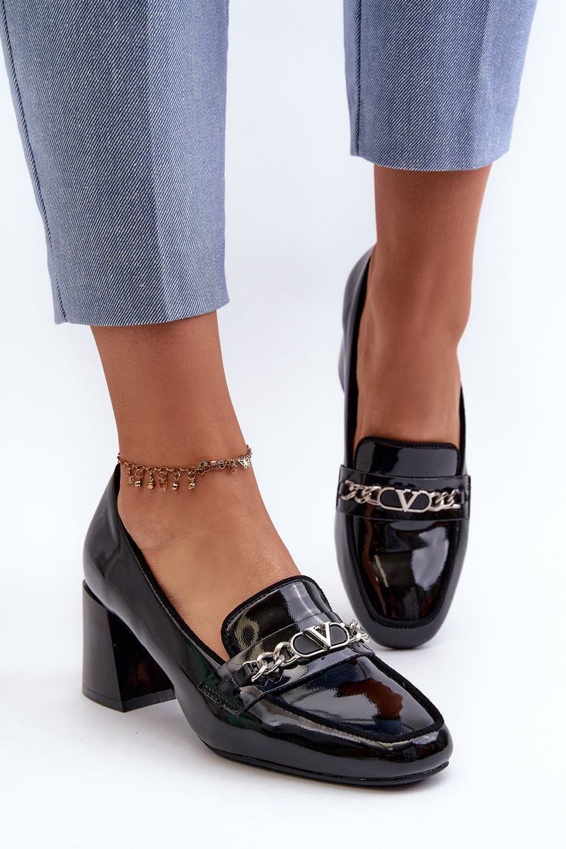 Black Patent Low Heel Court Shoes with Decoration Makki