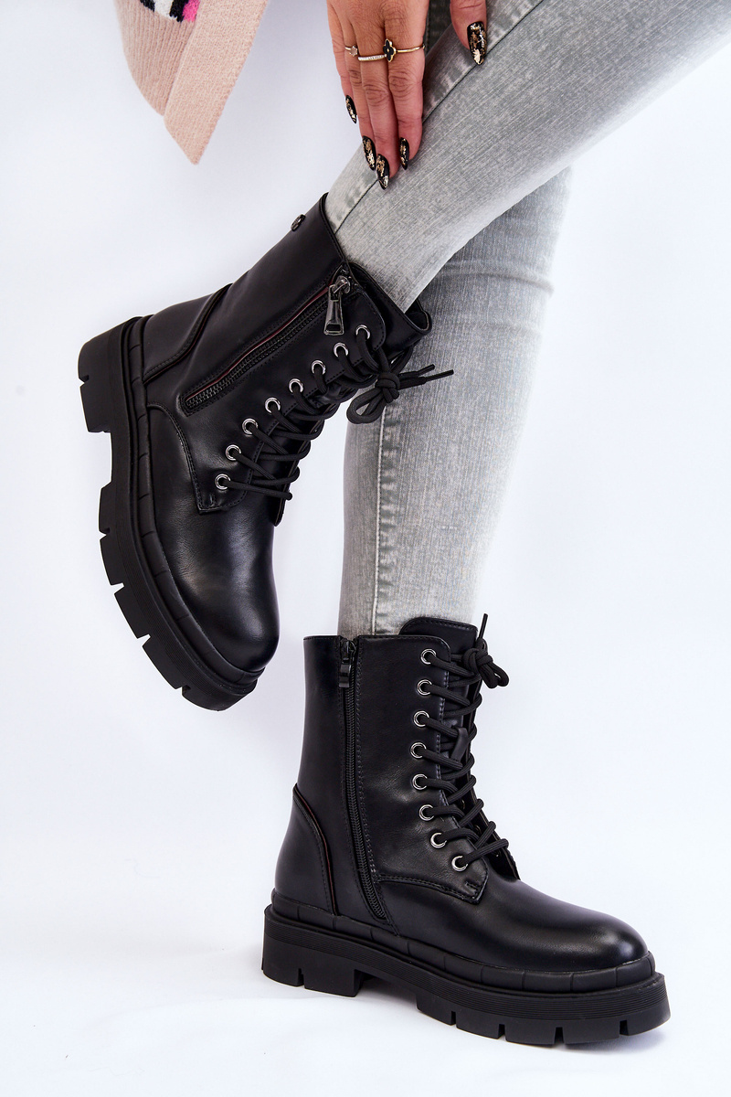 Classic women's boots made of eco leather. The model has a solid lacing and a zipper. In addition, there is a decorative zipper on the outside. The boots were set on a flat heel and a sole with a tread. The heel is stiffened. Trappers do not have insulation. This classic model should be in your wardrobe! When choosing a size, please refer to the size chart.
