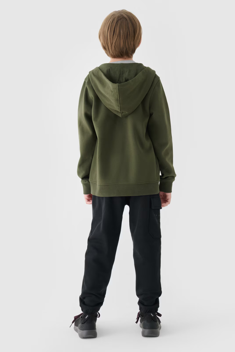 Boy's jogger sweatpants are perfect as an element of both casual and sporty everyday styles. They have a regular fit that comfortably adapts to the silhouette and tapered legs ending with an elastic cuff. The single jersey knit with a smooth surface on one side makes them elastic and comfortable to wear. The children's sweatpants are made of 80% cotton, making them soft, durable, and pleasant to the touch. The addition of polyester (20%) ensures that the material retains its shape and is resistant to wear even for many seasons. The brushed interior guarantees extra warmth, making the pants an ideal choice for cooler days. There are 2 open pockets on the sides. Additionally, there is a cargo pocket on the outer side of the right thigh. The leg features the inscription "Choose Your Own Sphere". An elastic waistband with external adjustment on a drawstring.