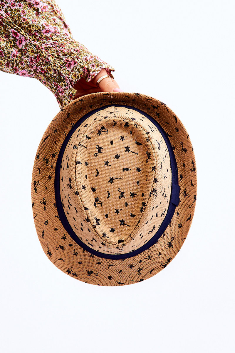 The fashionable children's hat has an animal and palm print. The product is made of 100% paper. The brim of the hat is slightly rolled up on one side and straight on the other. The hat does not have a circumference adjustment. There is also a decorative ribbon at the roundabout.
