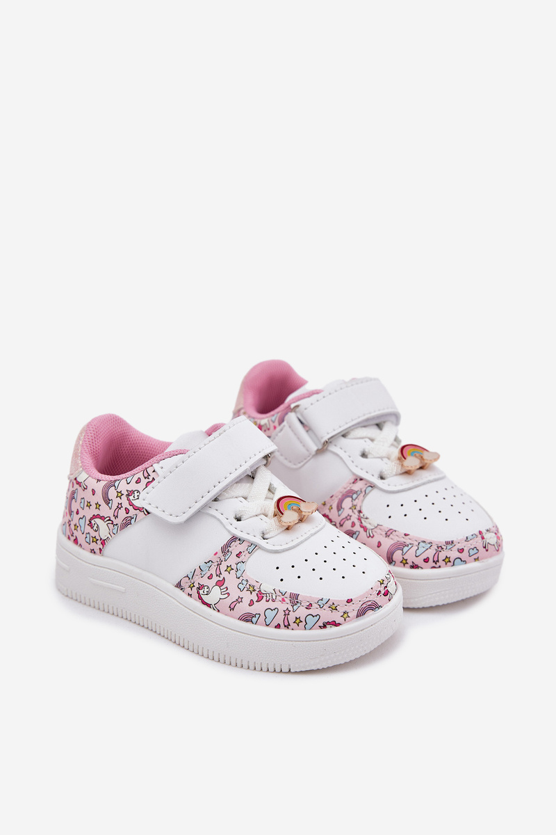 Children's sports shoes with a unicorn motif. Fastened with Velcro, featuring elastic bands that mimic lacing, they provide comfort and ease of putting on. A rainbow pin adds charm to them. The soft insole ensures comfort throughout the day, making them an ideal choice for kindergarten, school, and outdoor play. When choosing a size, please refer to the size chart.