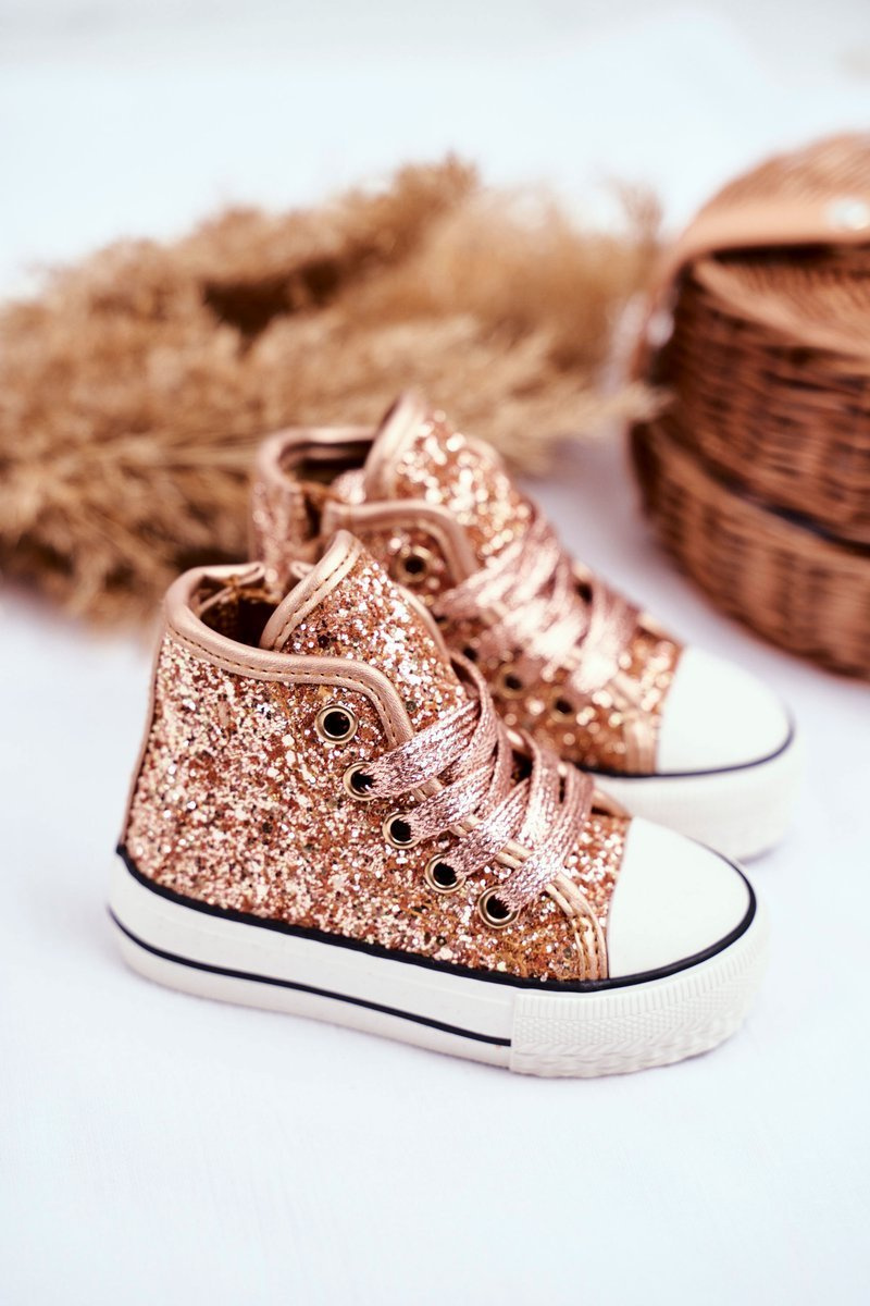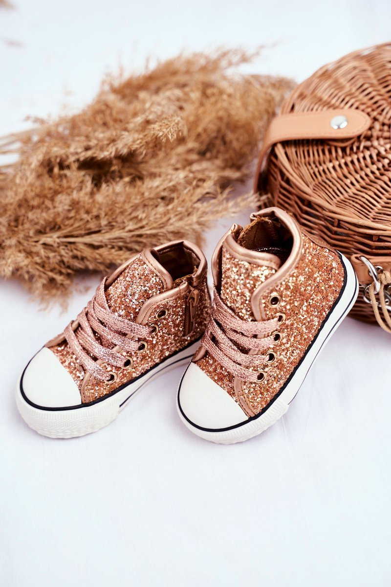 Children's sneakers covered with a delicate glitter. The shoes fit the shape of the foot well thanks to the soft, material uppers. They have a non-slip sole. Be sure to check out our entire collection of children's sneakers! When choosing a size, please use the size chart.