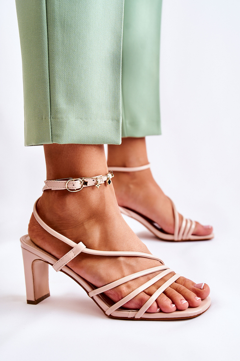 Women's sandals are made of eco leather. They have thin stripes, thanks to which they are extremely airy. Perfect shoes for all kinds of celebrations on hot days! Mounted on a post. Model with an open, square toe. Shoes fastened with a buckle with an adjustable strap. Be sure to check out the other models of high heels! When choosing a size, please use the size chart.