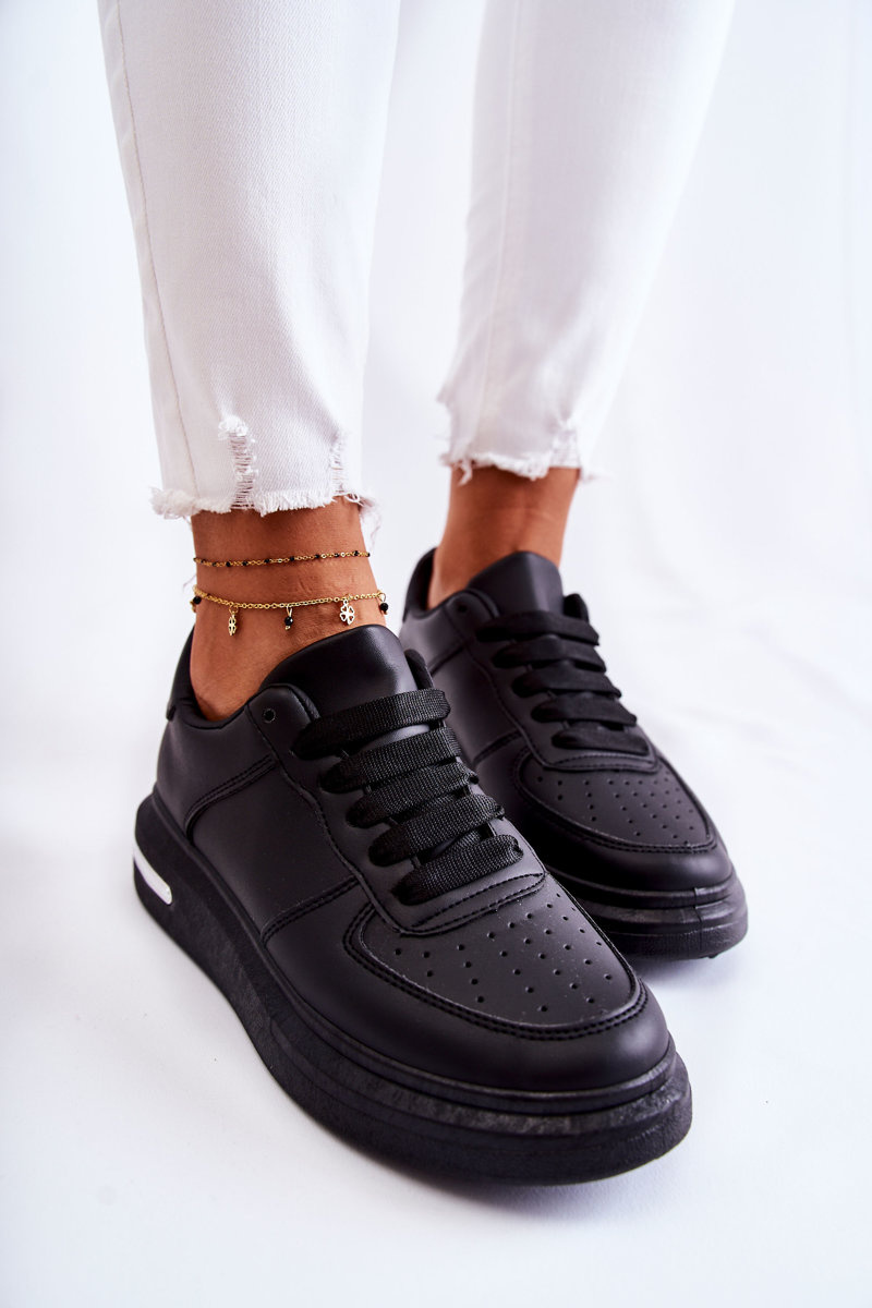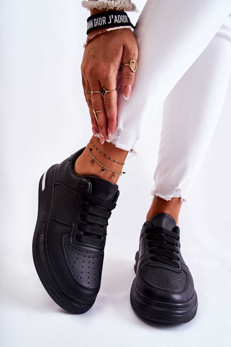Classic sports shoes are made of eco leather. They were mounted on a massive platform with a mirror element. The model is tied with flat laces. A soft insole made of foam is covered with fabric. Model with a perforation on the front, which allows for adequate air circulation. Rounded nose. You absolutely should have them in your wardrobe! When choosing a size, please use the size chart.
