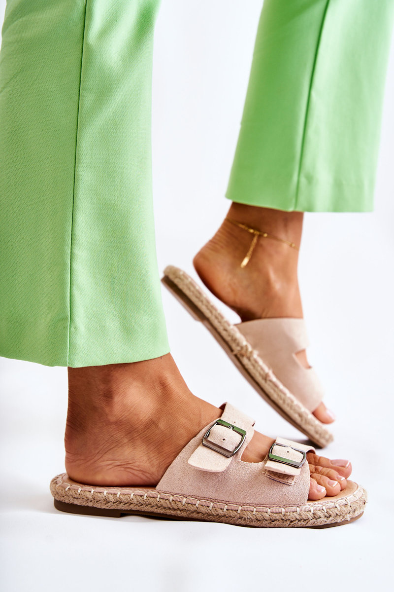 Classic women's slippers are made of eco suede. Set on a flat heel and non-slip sole. They have two adjustable straps with a buckle, thanks to which you can adjust the footwear to your own needs. There is a decorative jute braid around the sole. Comfortable eco-leather insole. Perfect for everyday use! Model with an open, rounded toe. When choosing a size, please use the size chart.