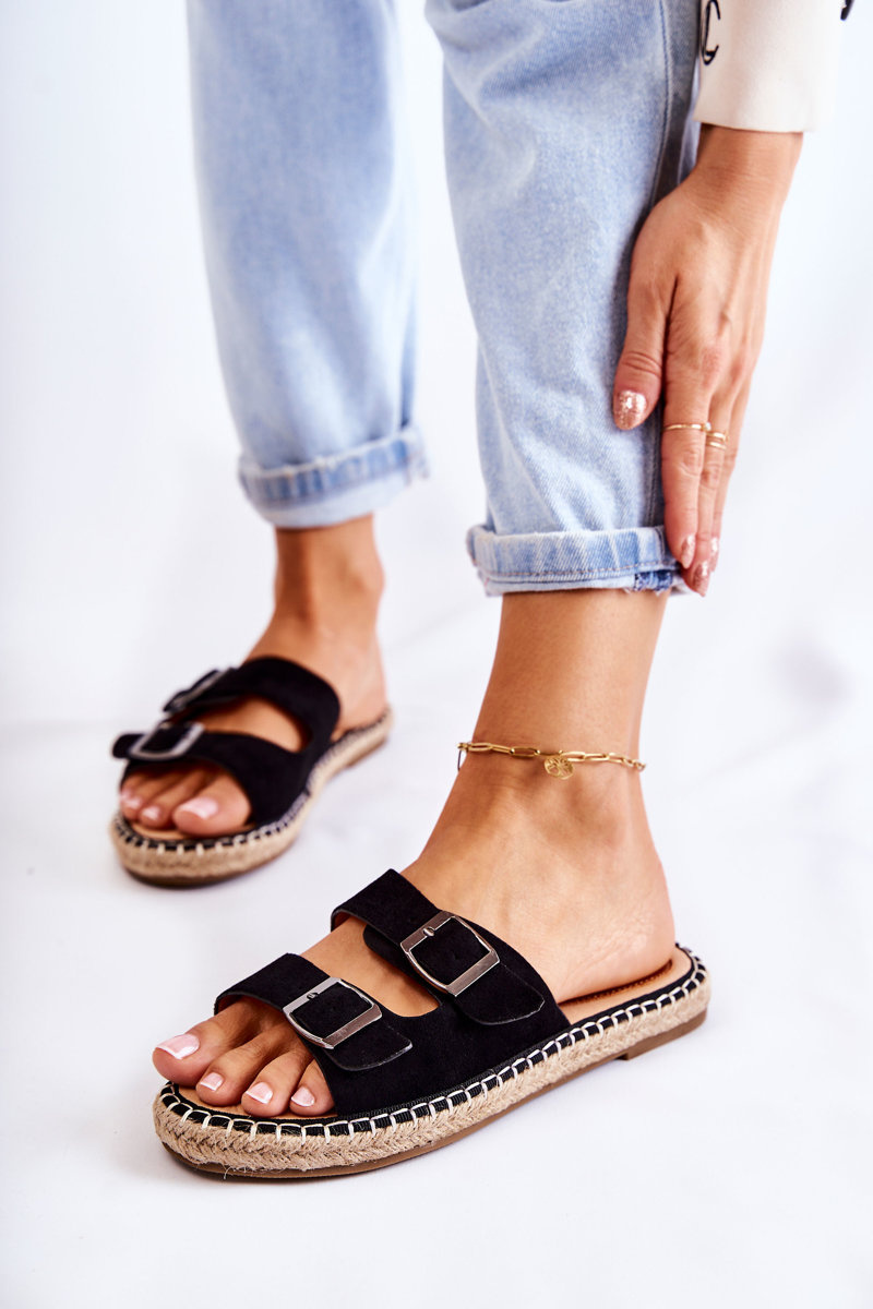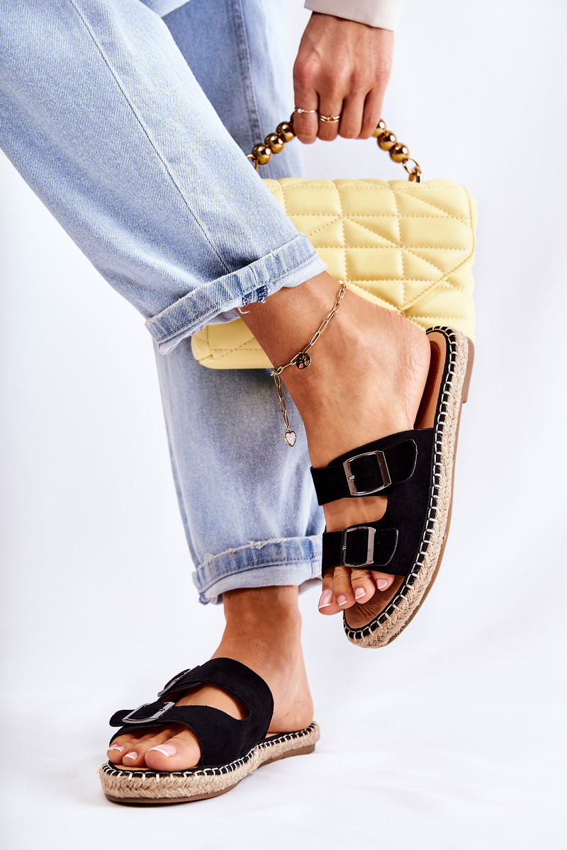 Classic women's slippers are made of eco suede. Set on a flat heel and non-slip sole. They have two adjustable straps with a buckle, thanks to which you can adjust the footwear to your own needs. There is a decorative jute braid around the sole. Comfortable eco-leather insole. Perfect for everyday use! Model with an open, rounded toe. When choosing a size, please use the size chart.