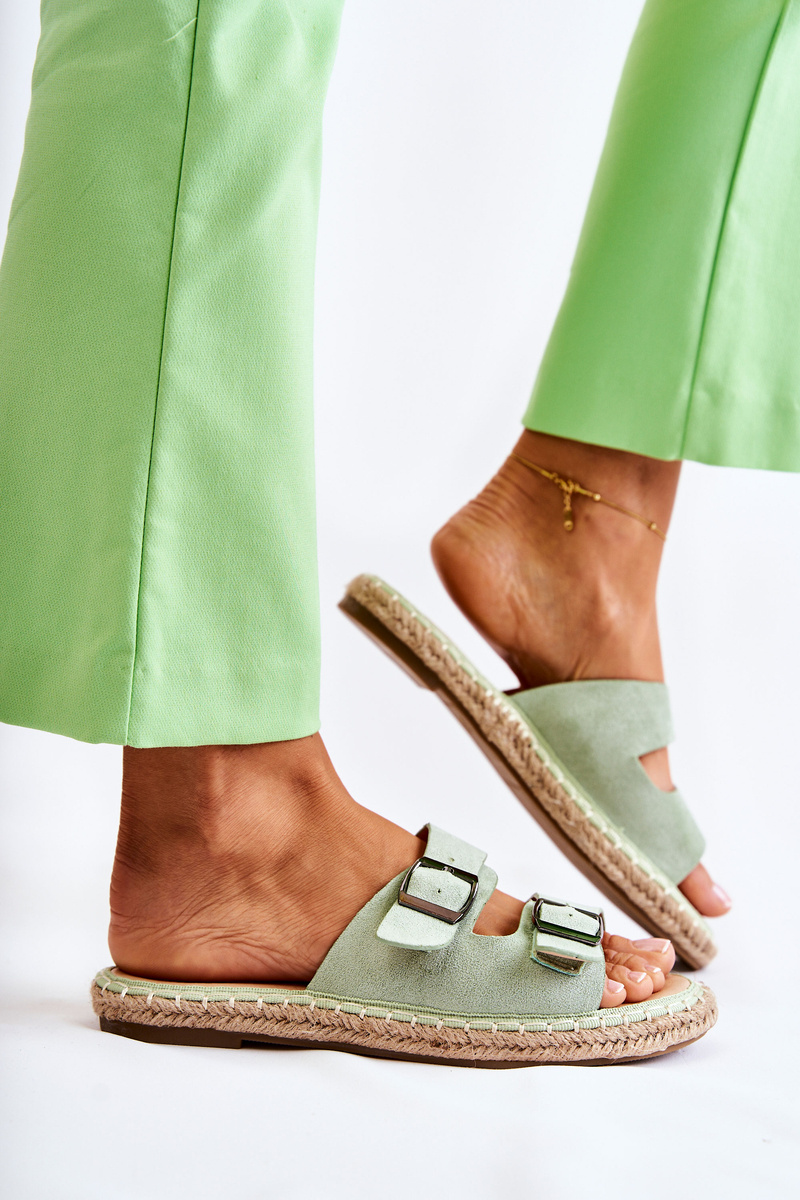Classic women's slippers are made of eco suede. Set on a flat heel and non-slip sole. They have two adjustable straps with a buckle, thanks to which you can adjust the footwear to your own needs. There is a decorative jute braid around the sole. Comfortable eco-leather insole. Perfect for everyday use! Model with an open, rounded toe. When choosing a size, please use the size chart.