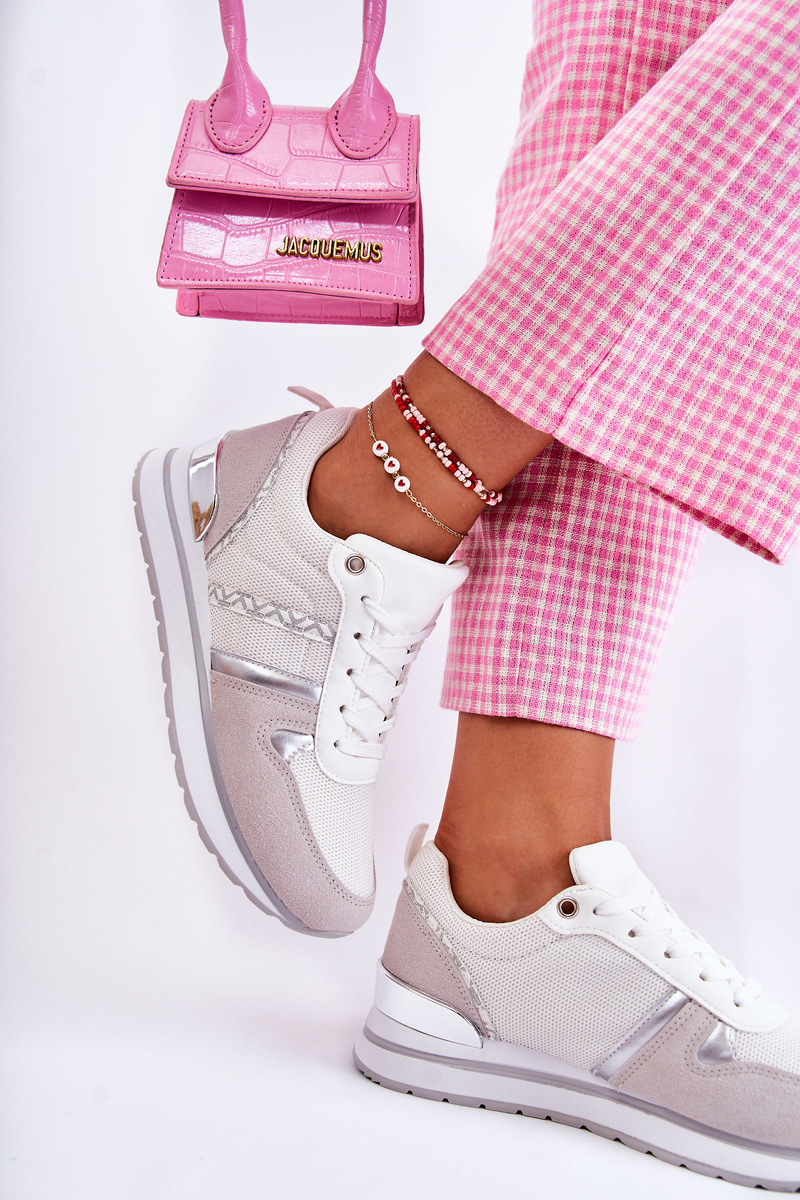 Sports shoes mounted on a flat sole with a delicate wedge. At the back, the sole is decorated with a mirror element. The soft ankle upper is made of a combination of breathable material, eco suede and eco leather. Inside the shoe there is a comfortable, fabric-covered foam insole. The model is tied with flat laces, which allows for a perfect fit of the shoe to the leg width. This sporty cut will look great with jeans or joggers. When choosing a size, please use the size chart.