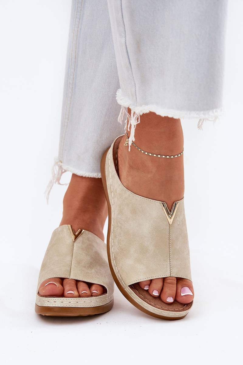 Elegant women's slippers made of eco-leather are a combination of style and comfort. Set on a wedge, they provide lightness and stability all day long. This model features a soft Comfortshoe insole with a cushioning effect, ensuring comfort even during prolonged wear. These slippers perfectly complement everyday outfits, combining elegance with functionality. Perfect for warm days! When choosing a size, please refer to the size chart.