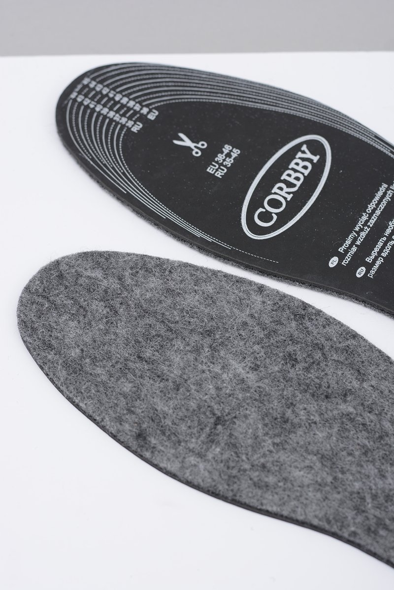 Two-layer warming insoles made of high-quality non-woven fabric and latex foam with active carbon, which perfectly absorbs any unpleasant odors. Felt lining, thanks to its thermal insulation properties, protects against moisture, provides feet with the right temperature, softness and comfort, while a layer of flexible latex balances the pressure on the sole while cushioning the microshocks that occur during walking.