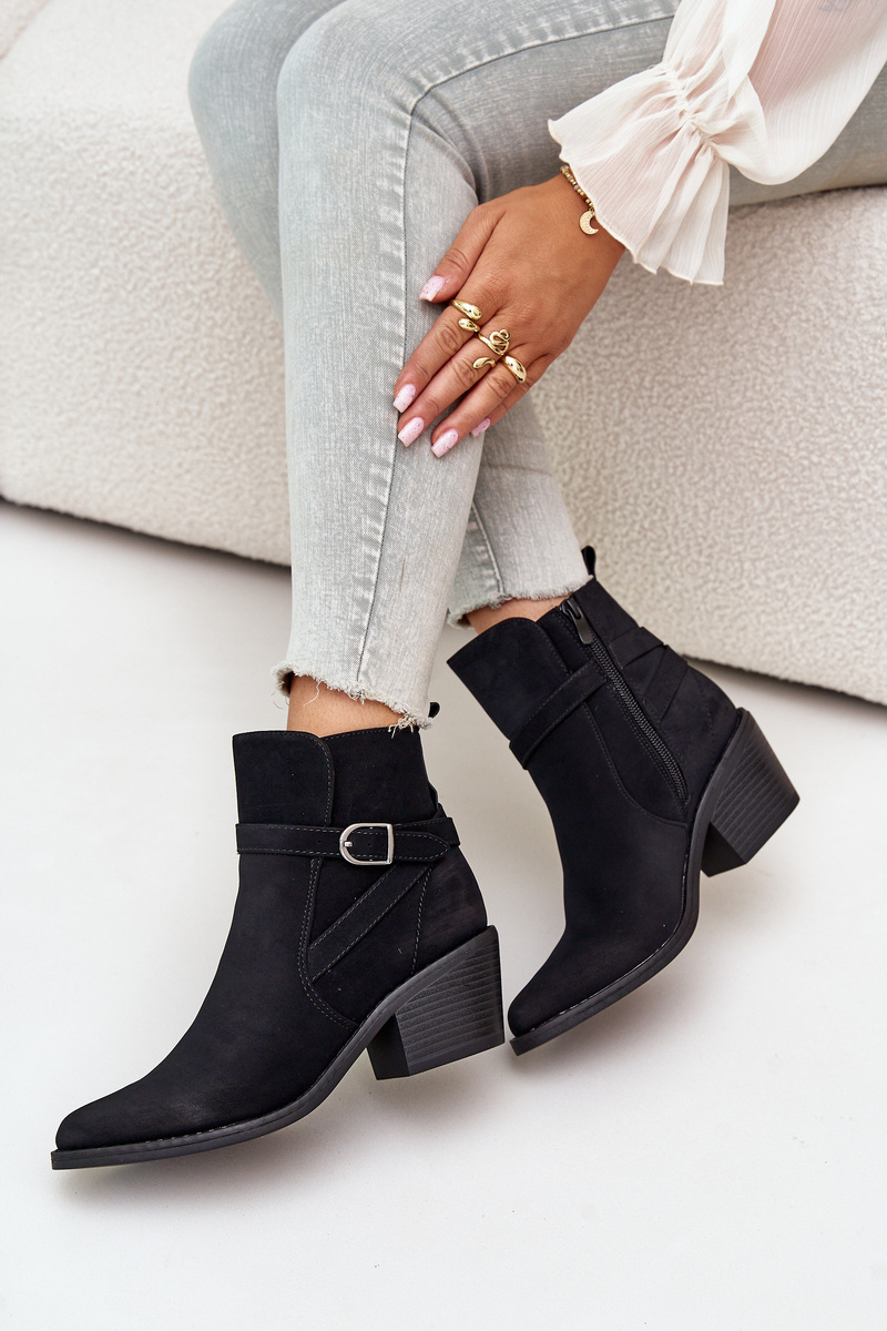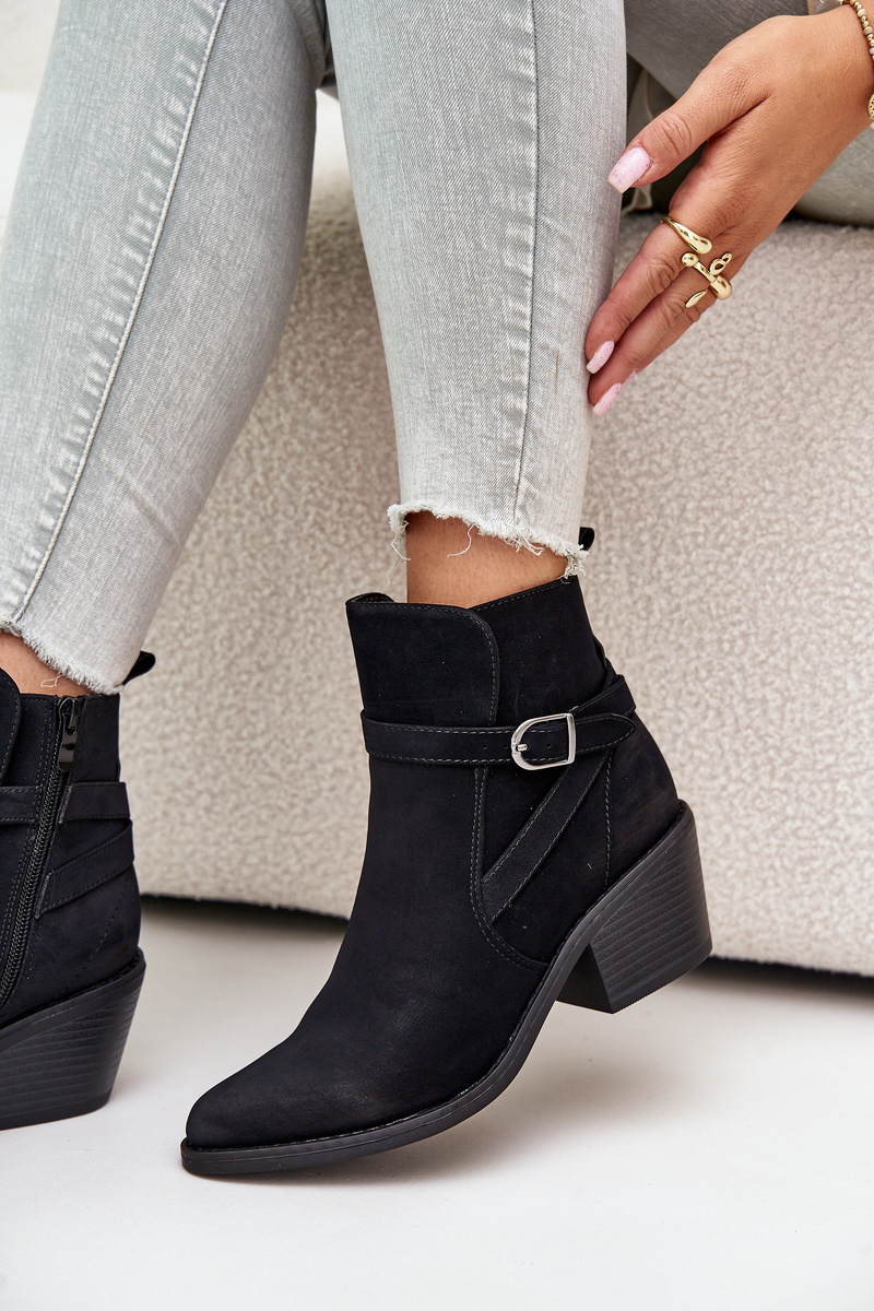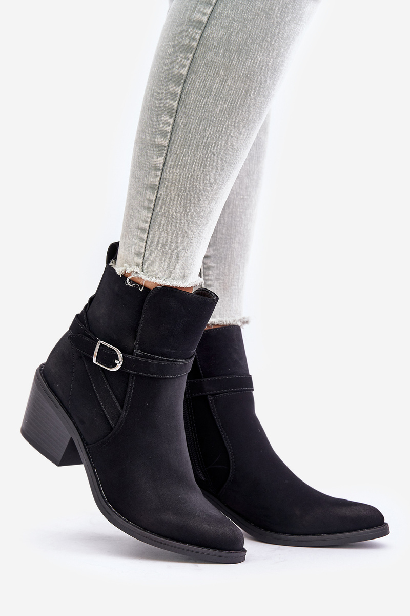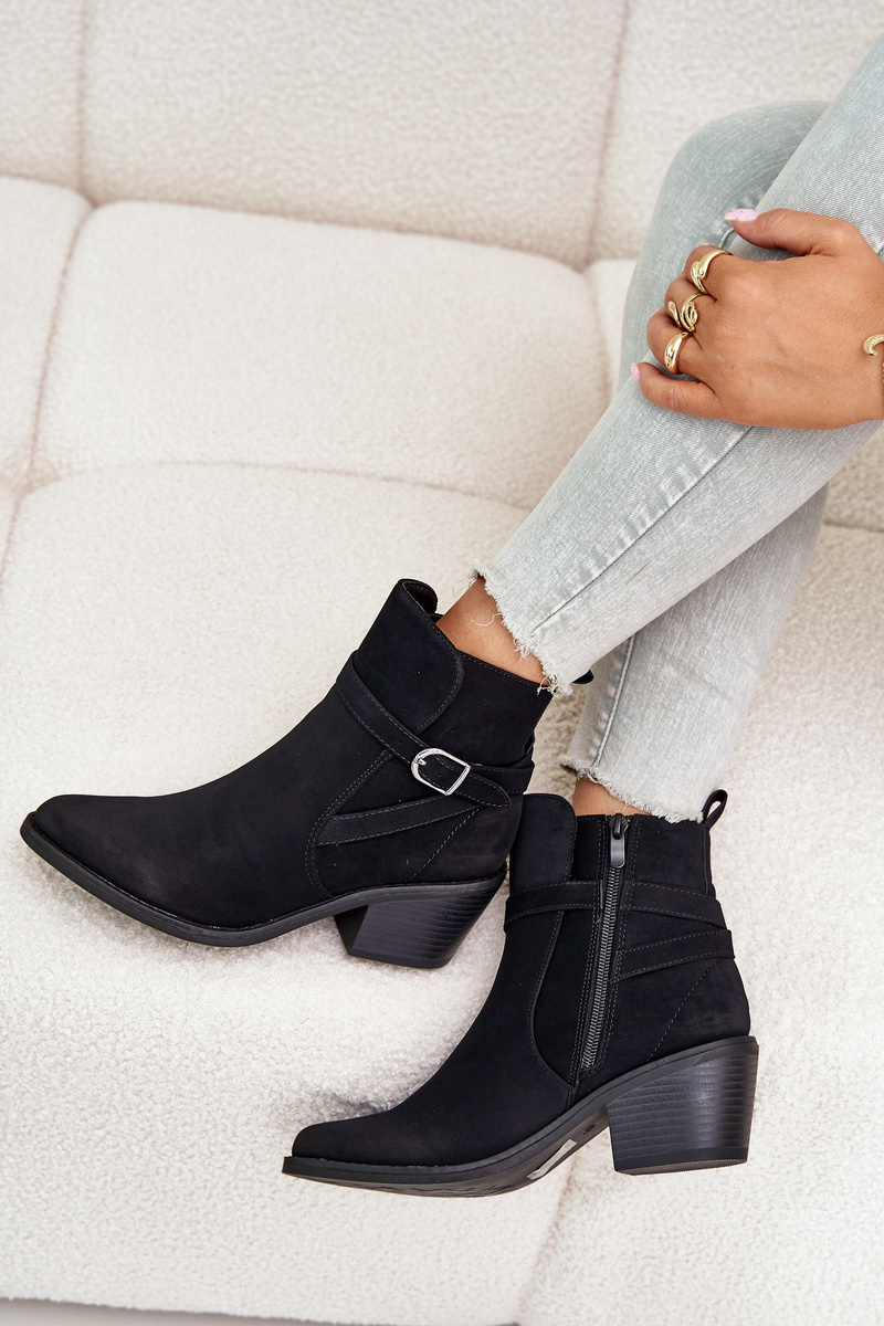 Ankle boots in cowboy style made of eco suede. Set on a block heel. Insulated with shoe fleece inside. Fastened with a zipper. The pointed toes will visually elongate the legs. This trendy style should definitely be yours! When choosing a size, please refer to the size chart.