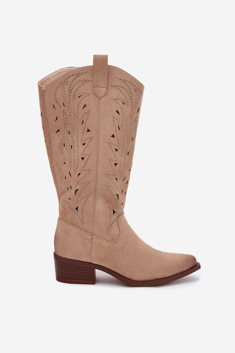 Cowboy Boots With Perforated Pattern On Low Heel Beige Selirae