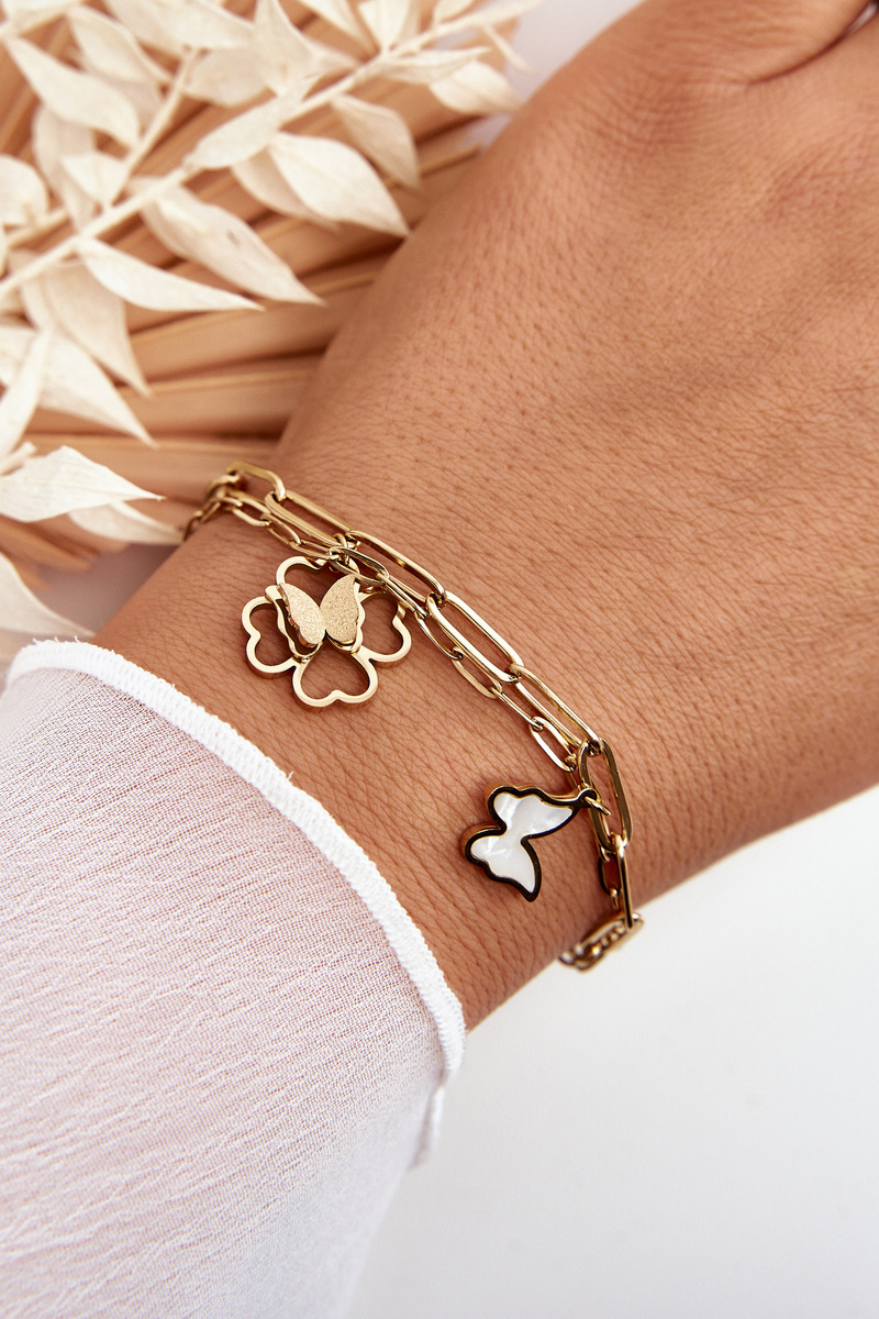 The unique bracelet will be perfect not only for elegant stylizations, but also for casual ones. It was made of stainless steel. It has a classic carabiner clasp with adjustable length. This bracelet with decorative pendants in the form of shamrocks and butterflies should be yours!