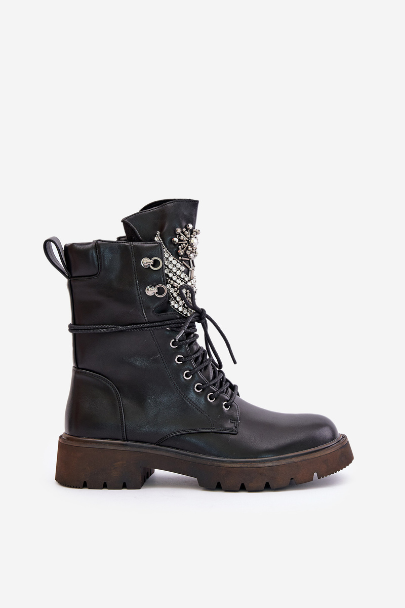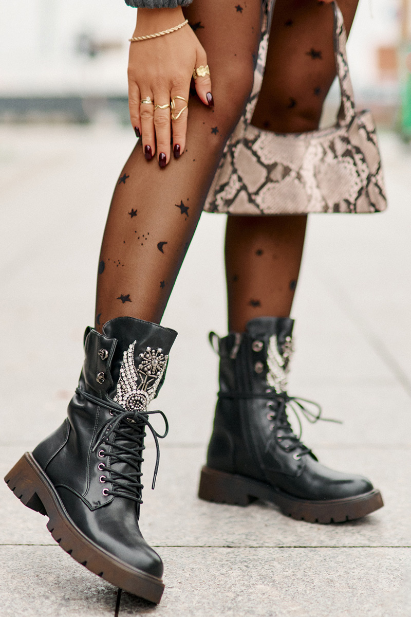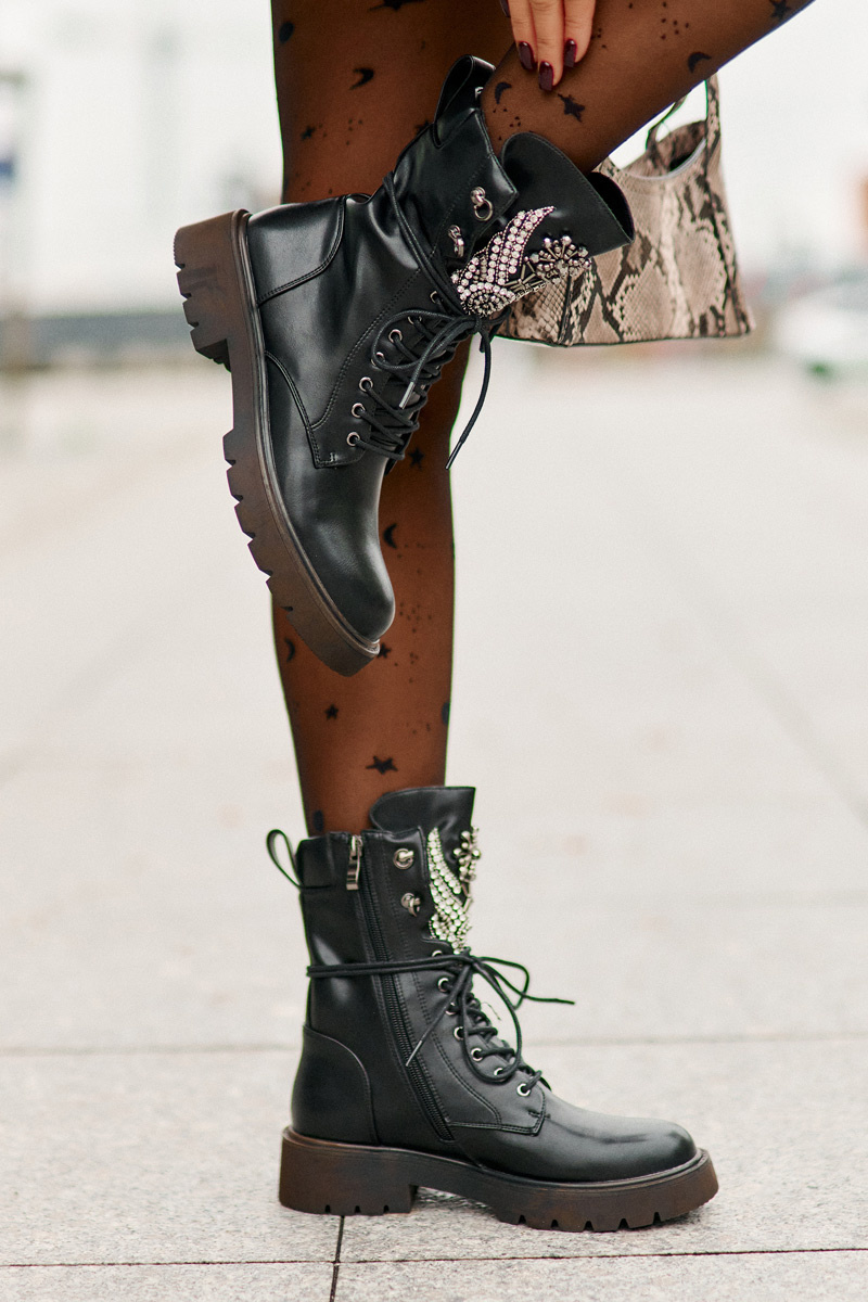Insulated worker ankle boots made of eco-leather are a stylish and functional option for cooler days. Set on a flat heel, they provide comfort while wearing, and thanks to the zipper and lacing, they can be easily adjusted to the foot. Rounded toes add a classic look, while the embellishment on the tongue introduces a fashionable accent. This is the perfect choice for those who value comfort and original design in everyday outfits. When choosing a size, please refer to the size chart.