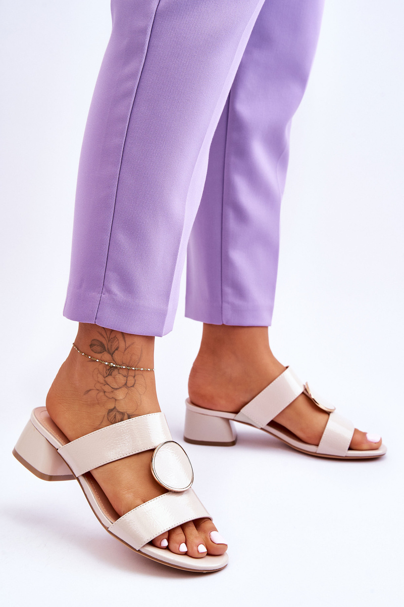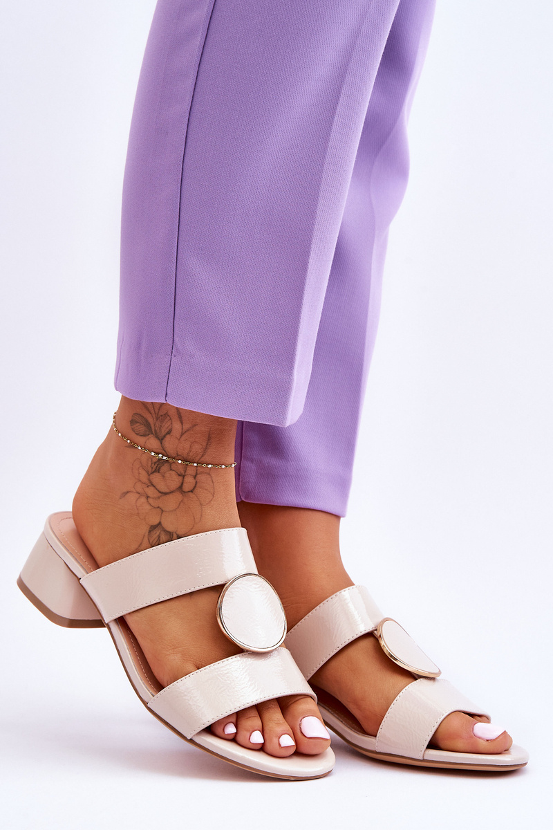 Elegant women's slippers are made of eco leather. This model was mounted on a heel in the form of a block. They have a decoration between the stripes in the shape of a circle. The soft insole will provide comfort even throughout the day and is made of natural leather. Fashionable, classic cut with an open, rounded toe. When choosing a size, please refer to the size chart.