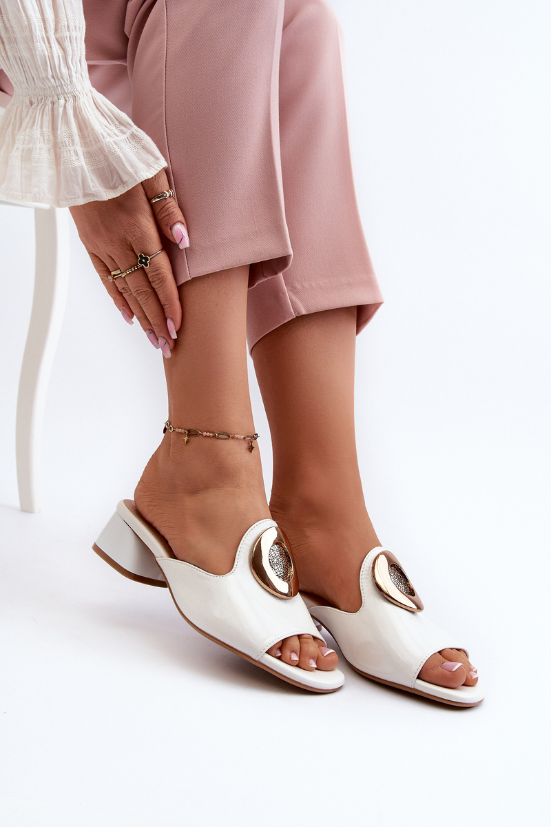 Elegant Lacquered Women's Mules with Low Heel and Gold Decoration White Uzimila