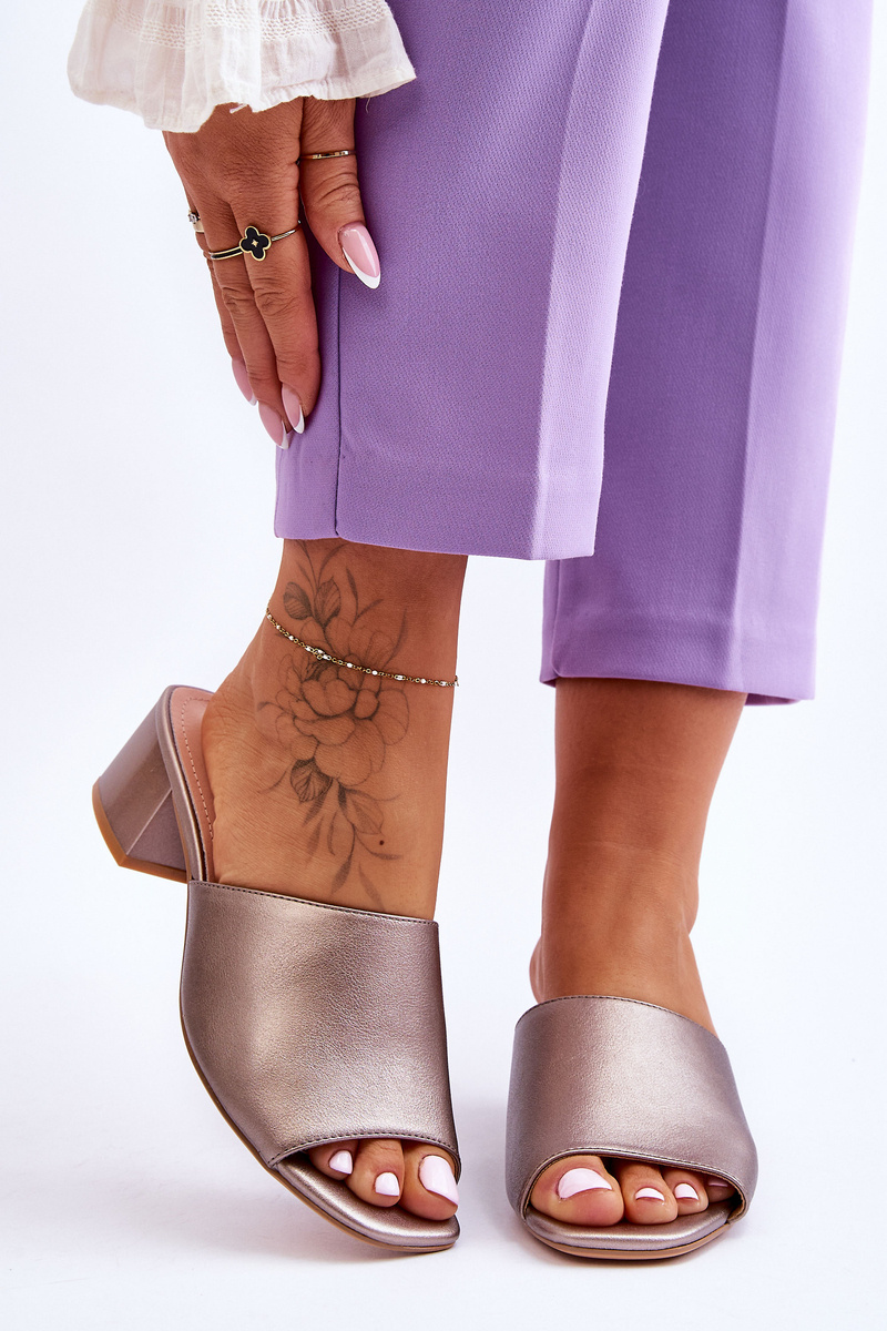 Classic, yet elegant women's slippers made of eco leather with attention to detail. This model was set on a low heel in the form of a block. The soft insole made of natural leather will ensure comfortable use. This cut will be perfect for various celebrations or for work on hot days.When choosing a size, please follow the size chart.
