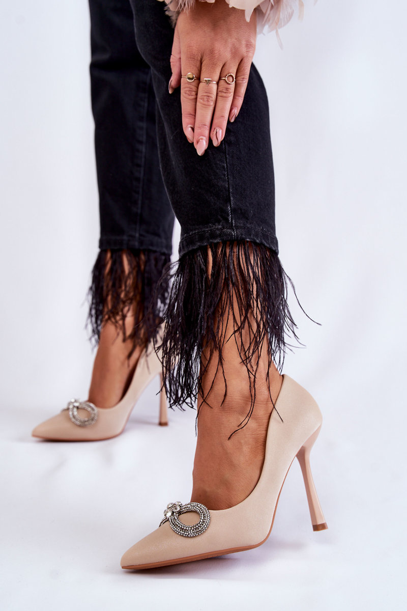 Elegant high heels are made of textile material. On the front there is a decorative bow with sparkling jets. A pointed toe and a heel tapered upwards in the form of a pin will make your legs look slimmer. A soft eco-leather insole will ensure comfort during use. This model will add charm to your stylizations! When choosing a size, please use the size chart.