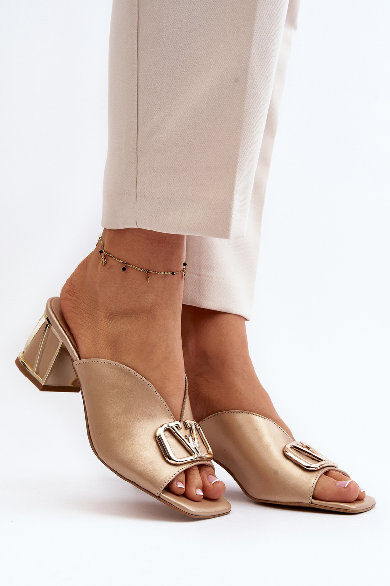 Elegant women's sandals are perfect for the summer season. Made of natural leather. Set on a block heel. A gold ornament at the front. You can match this style with elegant skirts, pants, and dresses. You definitely should have them! When choosing a size, please refer to the size chart.
