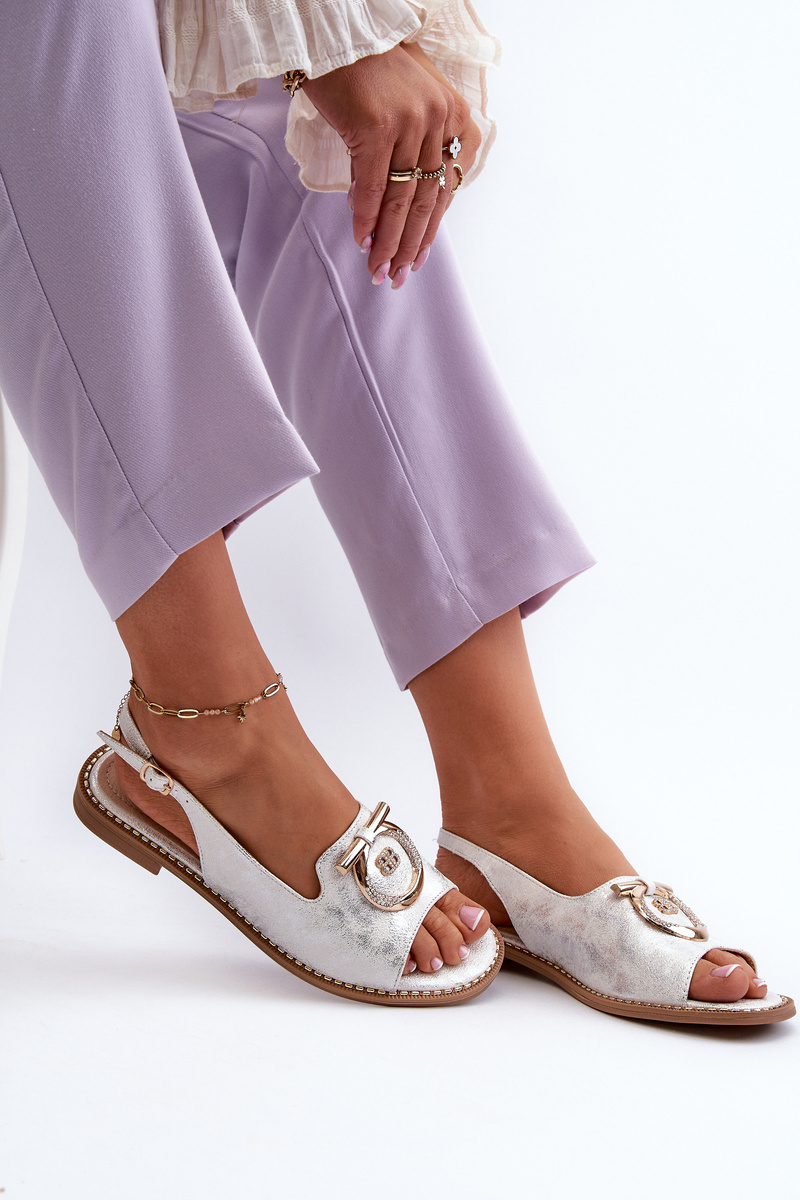 Elegant Women's Sandals with Gold Decoration on Flat Heel Silver S.Barski KV27-053
