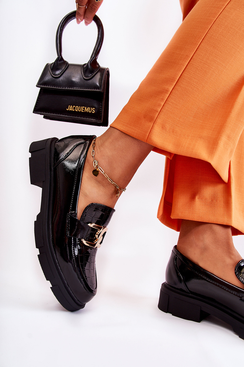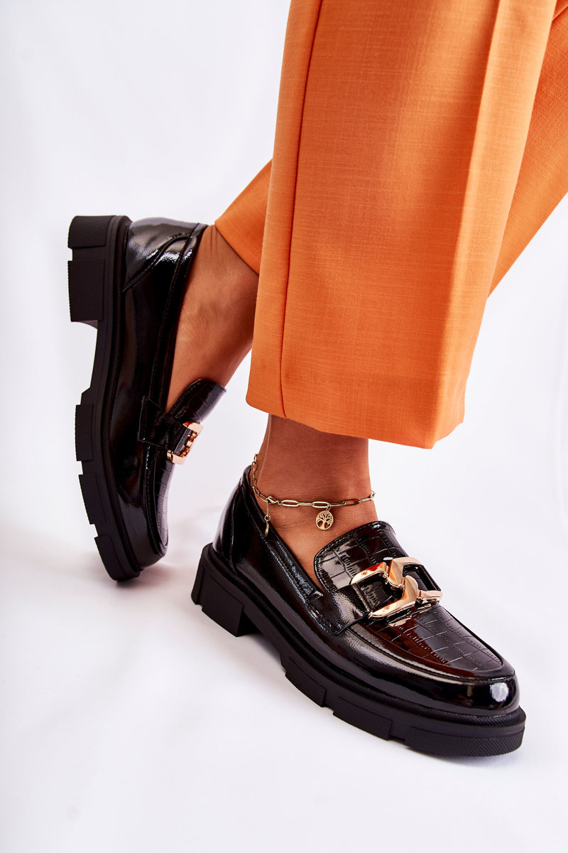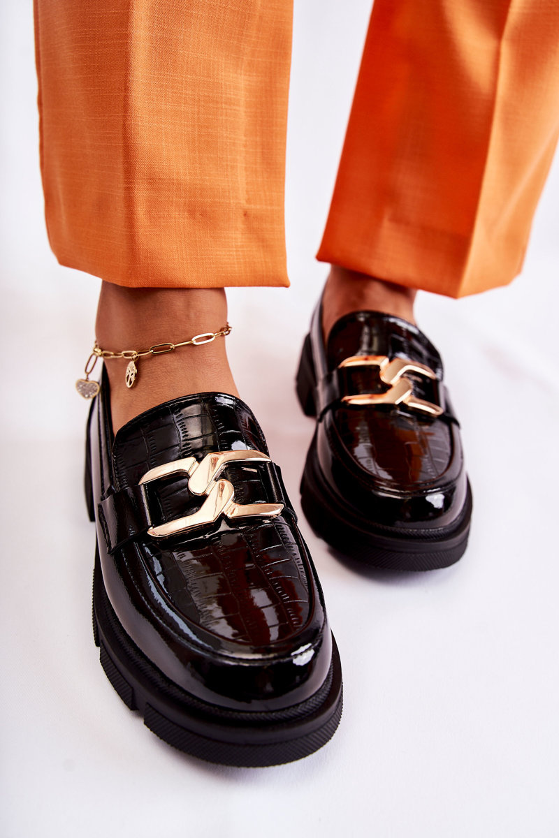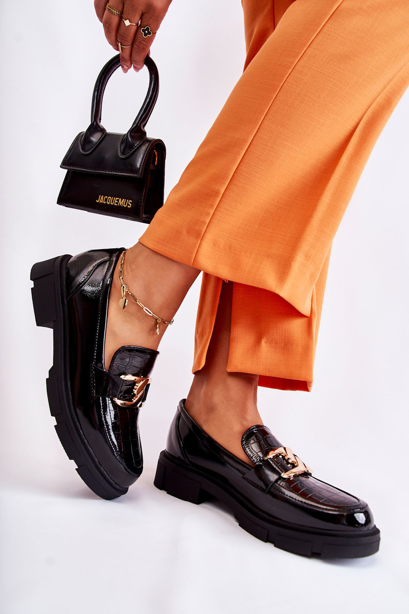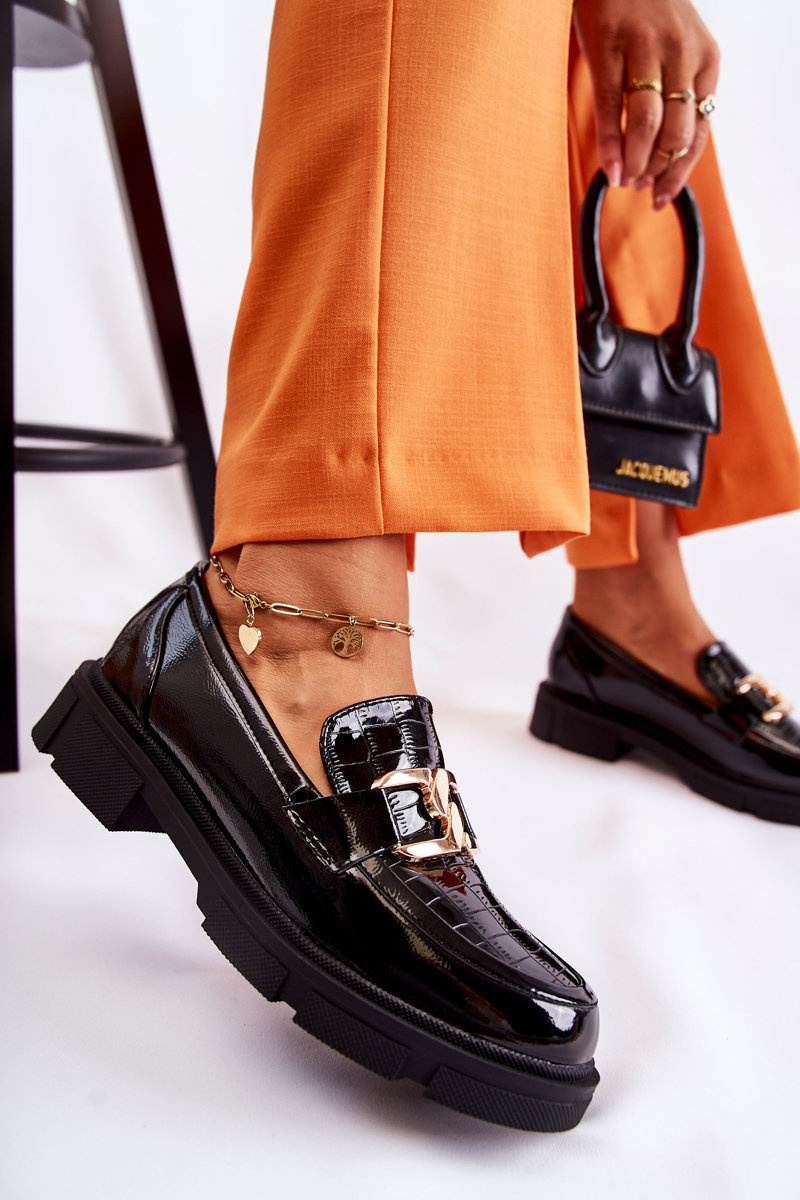 Fashionable shoes made of soft eco leather. They have a rounded toe. They are mounted on an irregular, thick sole with a flat heel. Upper ankle. At the height of the metatarsal, there is an effective ornament in the form of a plastic chain. A soft insole made of eco leather will provide comfort for your feet even throughout the day. Elegant loafers perfectly match classic trousers or a skirt. When choosing a size, please use the size chart.