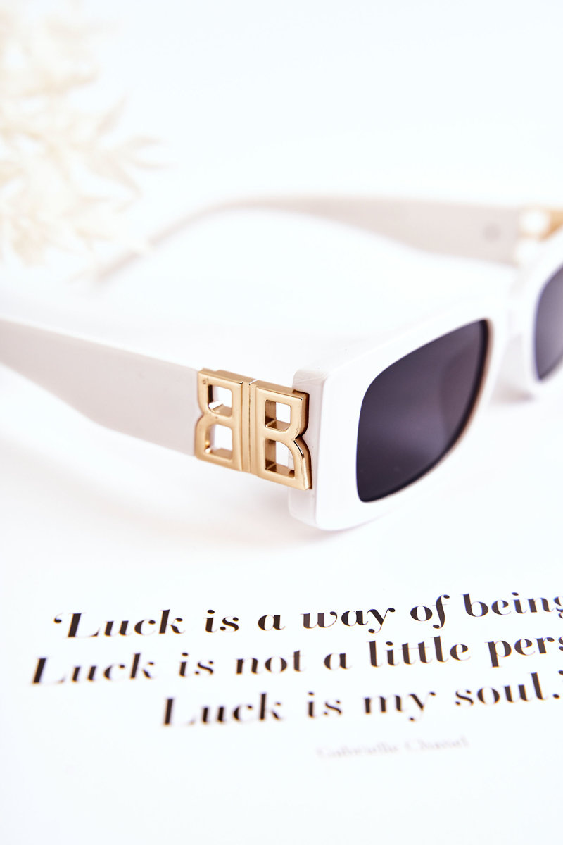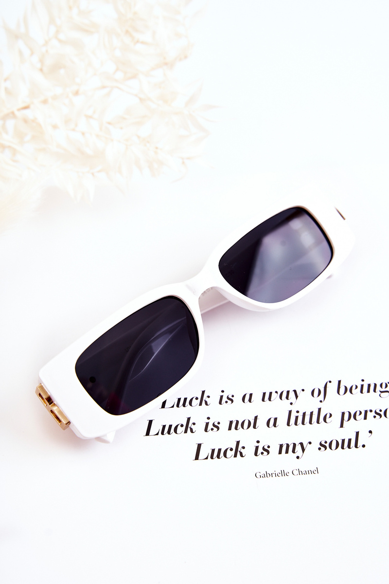 Fashionable sunglasses are great for many situations! Not only during the summer season, but also in the winter season, when the sun's rays reflect off the snow. Rectangular, 90's style model with small lenses. Made of plastic. The temples are tapered towards the end and are decorated with a golden element. Manufacturer's information: glasses absorb harmful UV rays, category 3.