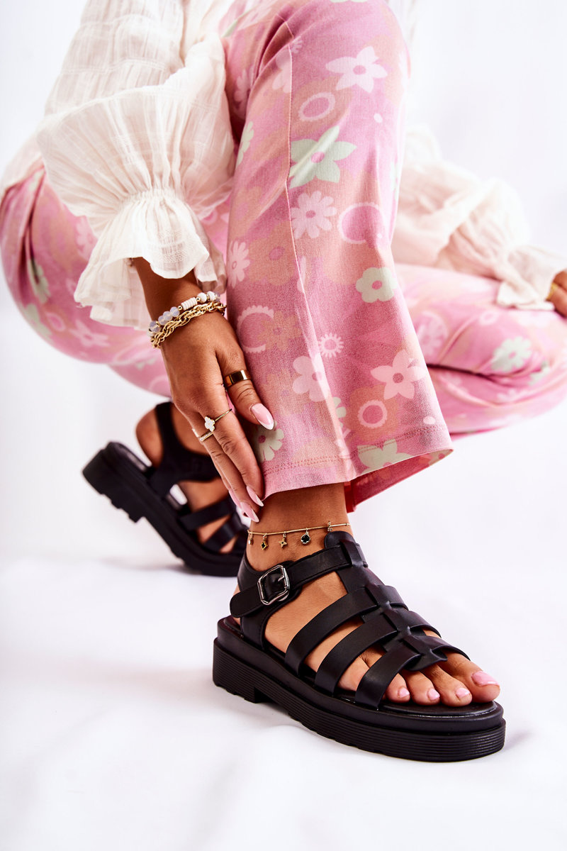 Extremely airy sandals made of eco leather. Fastened with an adjustable belt with a buckle. The sandals have an open, rounded toe and an exposed heel. A soft, eco-leather insole will ensure comfort during use. A flat heel and a platform make the shoes extremely stable. These sandals are the perfect cut for hot days. They will look great with both trousers and dresses. When choosing a size, please use the size chart.