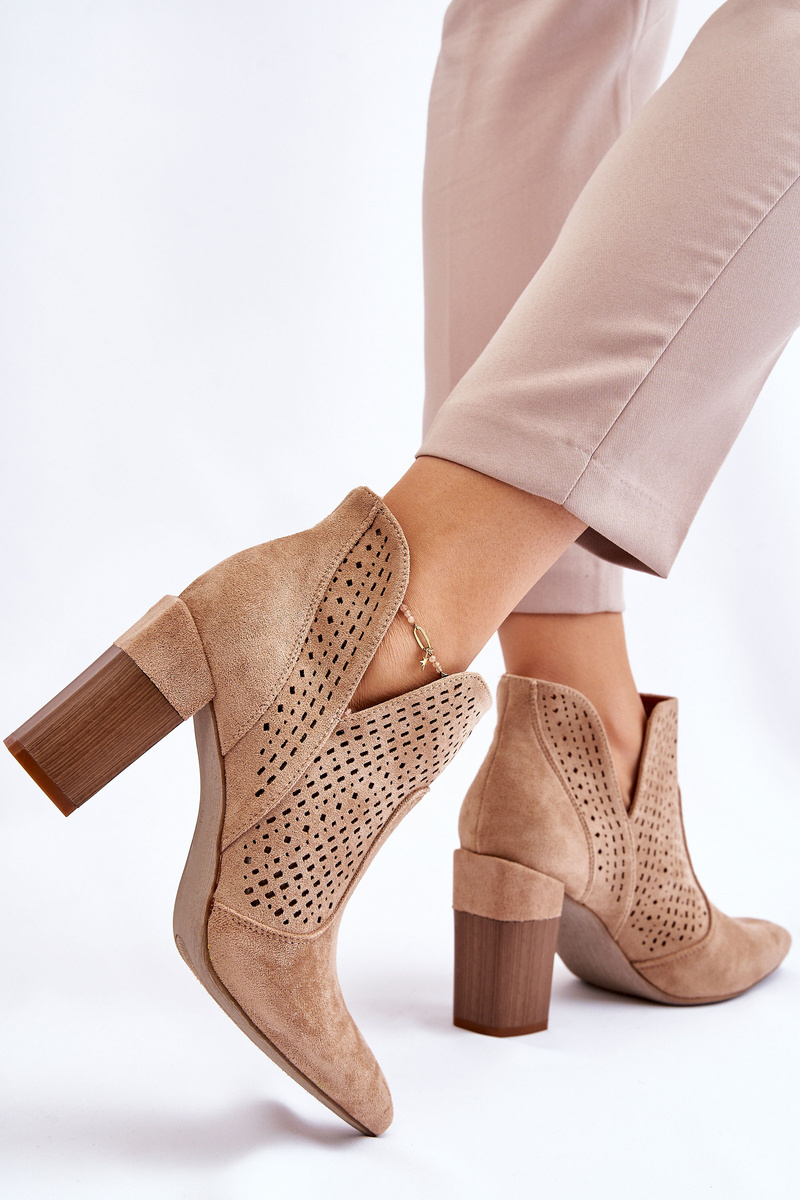 Fashionable Suede Openwork High Heel Boots Beige Genevi