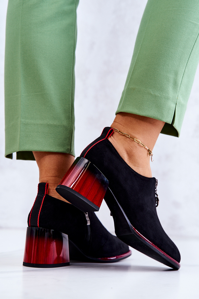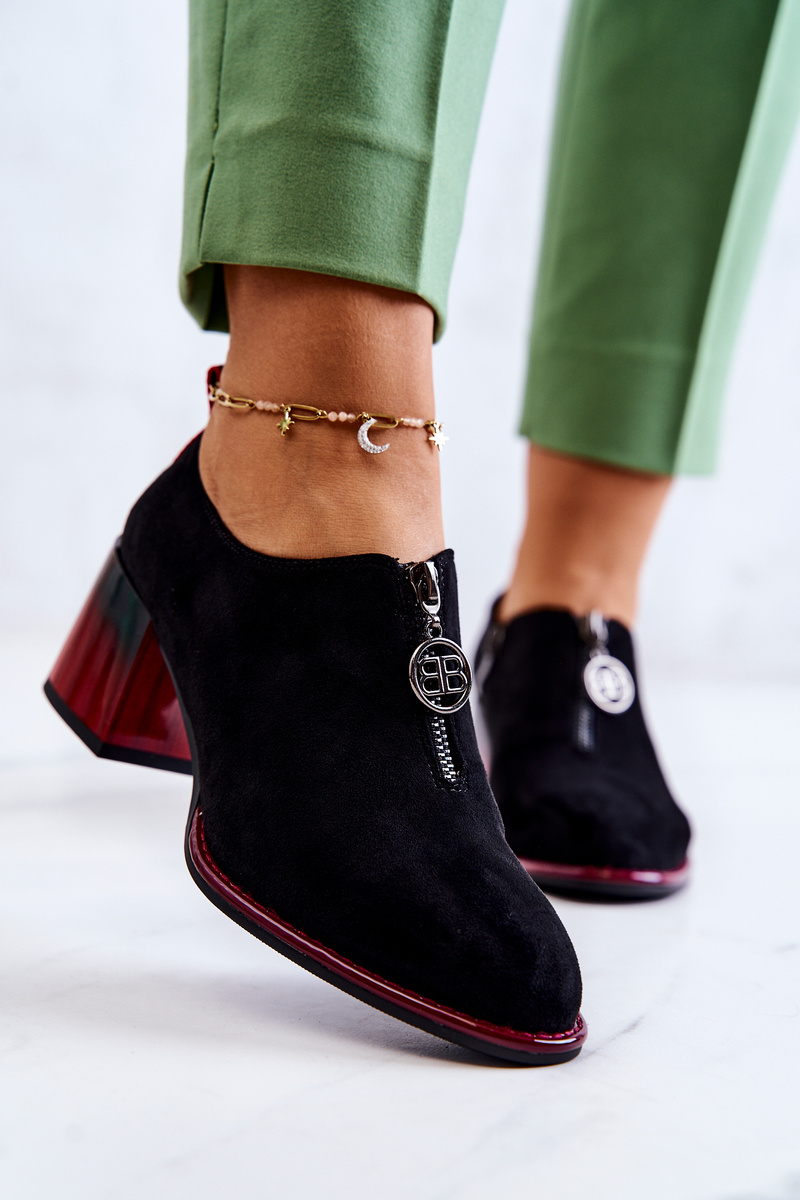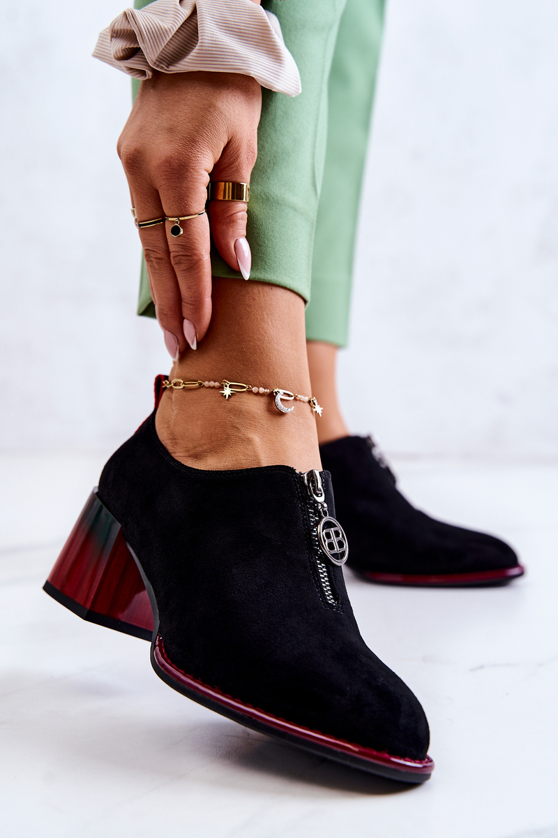 Shoes with an uppers above the ankle and a zipper for easy putting on shoes. Set on a heel in the form of a massive post. Made of eco suede leather with a stiff heel counter. They have a loop on the back for easy putting on and taking off the shoes. Almond-shaped nose. Additionally, they have a decorative zipper on the front. The soft insole is made of natural leather. This model will perfectly emphasize your stylizations! When choosing a size, please use the size chart.