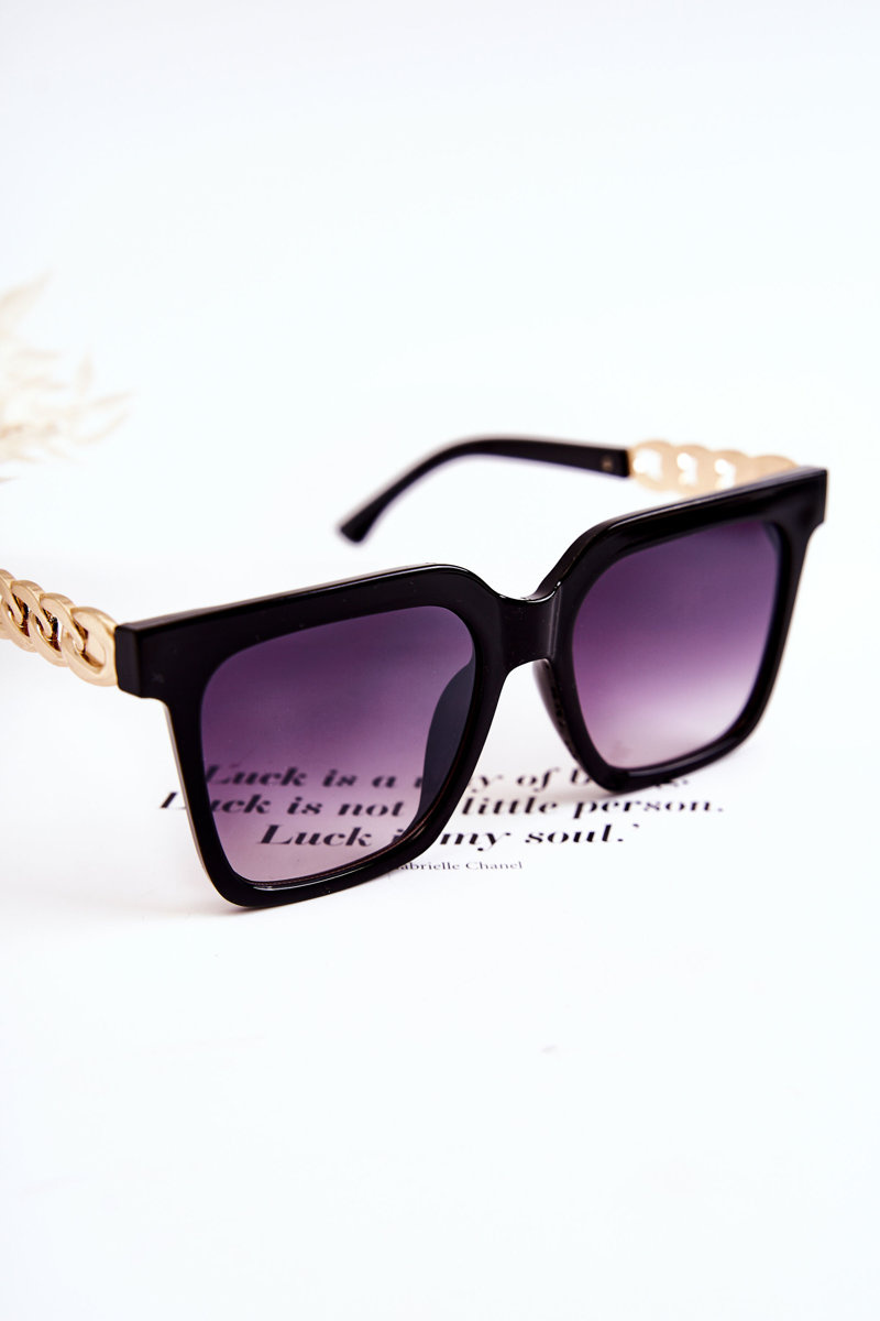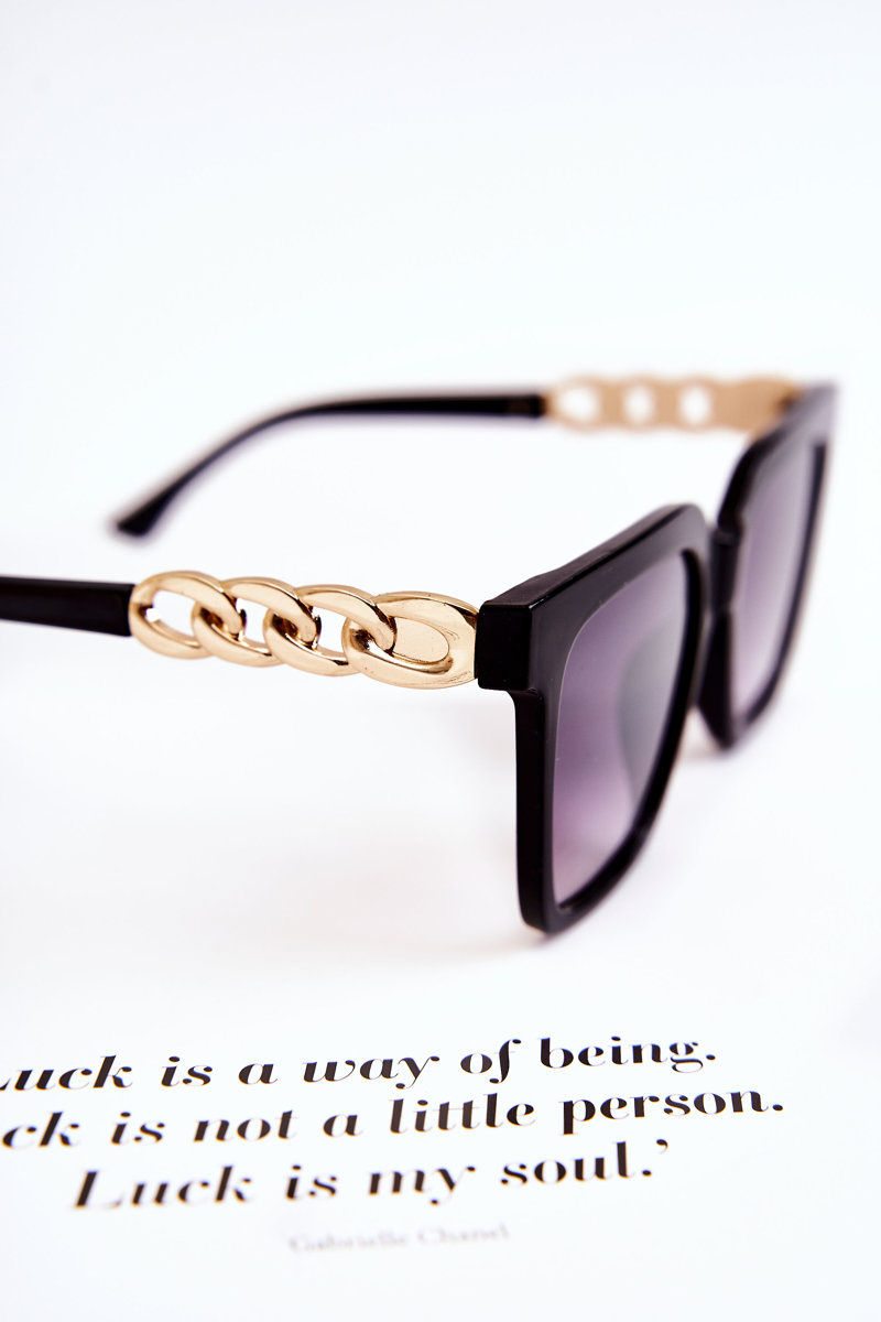 Fashionable sunglasses are great for many situations! Not only during the summer season, but also in the winter season, when the sun's rays reflect off the snow. Square model. It has thin lens frames at the bottom and sides, and thicker at the top. Plastic bridge. Temples made of plastic with a decorative addition in the form of a chain. Manufacturer's information: glasses absorb harmful UV rays, category 3.