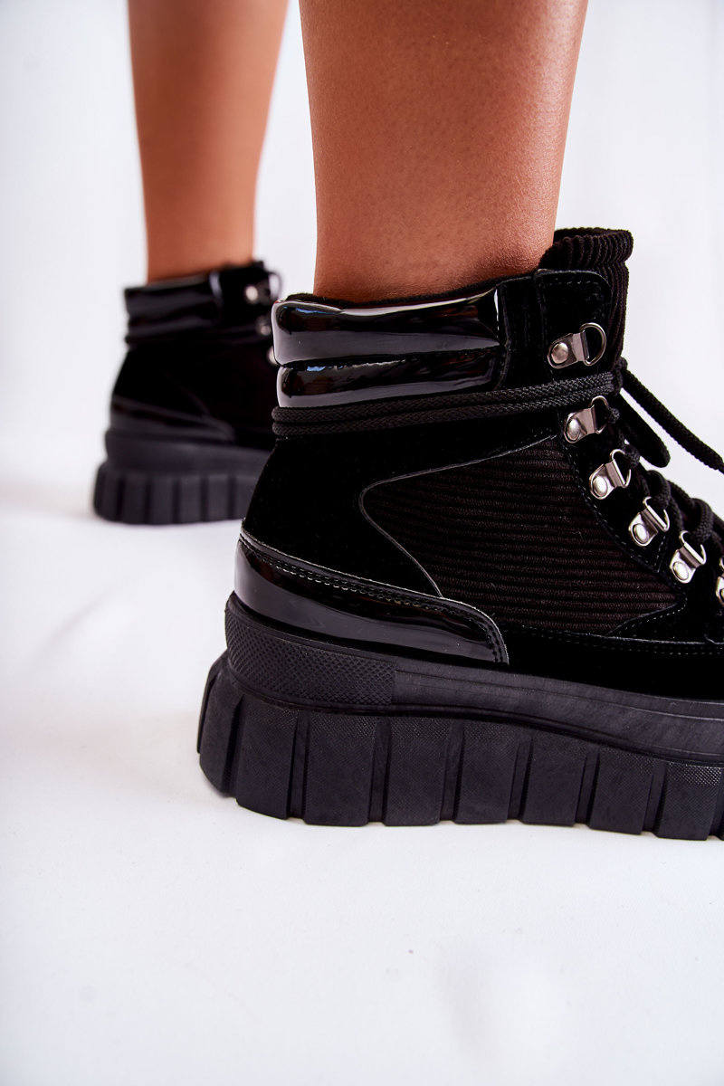 Fashionable women's boots are made of a textile upper. They have eco leather inserts. The model is tied with round laces. The inside is insulated with a shoe blanket. Boots mounted on a platform with grooves. Non-slip sole. Rounded nose. You should have this model in your wardrobe! Don't wait any longer - buy today! When choosing a size, please use the size chart.