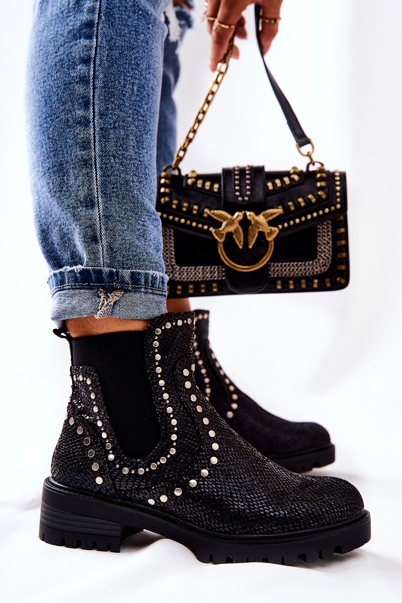 Slippers made of eco leather. With elastic bands on the sides of the upper and decorative studs. Flat heel and trapper sole ensure stability. Match perfectly with skirts and waxed trousers. Be sure to check out our other offers! Please refer to the size chart when choosing your size.