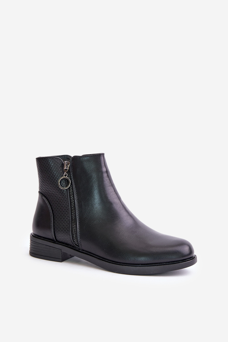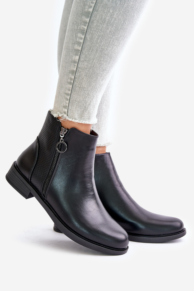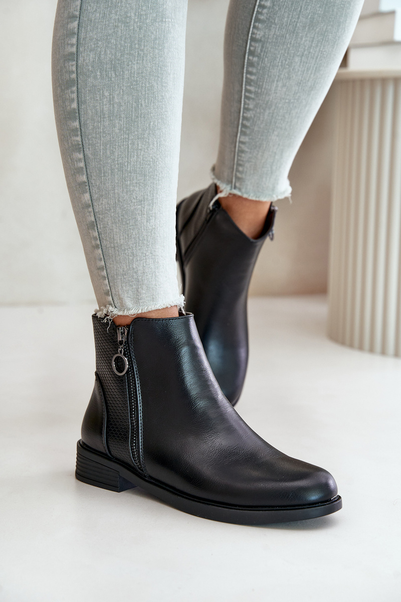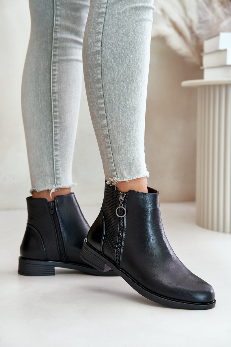 Women's ankle boots made of eco leather. Set on a flat heel. Fastened with a zipper. Interior insulated with shoe fleece. This model is distinguished by embossing on the upper. The toes are rounded. A classic style that you can match with many autumn outfits! When choosing a size, please refer to the size chart.