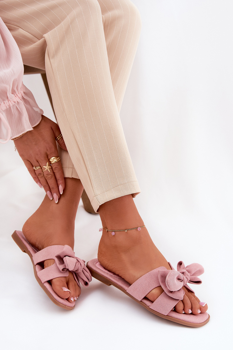 Women's slippers made of eco-suede. Set on a flat heel, combining comfort with subtle style. The front of the shoes is adorned with cutouts and a lovely bow, giving them a unique character. Perfect for everyday styling. When choosing a size, please refer to the size chart.