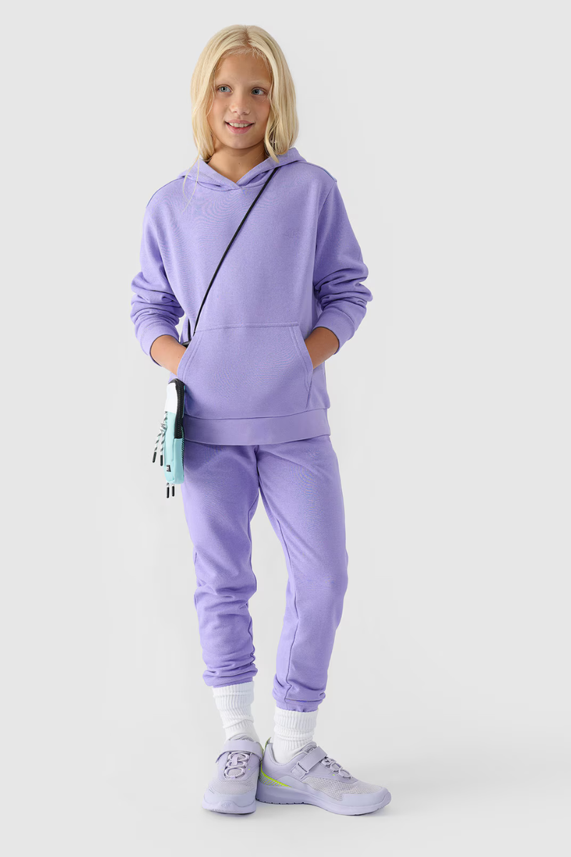 The girls' non-zip hoodie with a hood is perfect as an element for both casual and sporty styles for everyday wear. It has a regular cut that comfortably adapts to the silhouette. The french terry fabric is smooth on one side, while the other side features a visible loop texture. The fabric in this weave is soft, more flowing, and thinner to the touch. The girls' hoodie with a hood has a medium weight of 280 gsm, making it soft and more breathable. The non-zip hoodie for girls is made of 80% cotton, which makes it soft, durable, and pleasant to the touch. Thanks to the addition of polyester (20%), the material maintains its shape and is resistant to wear even for many seasons. Integrated hood at the neckline. Elastic cuffs with a drawstring. Front open kangaroo pocket. Pulls over the head. Bottom with a wide drawstring.